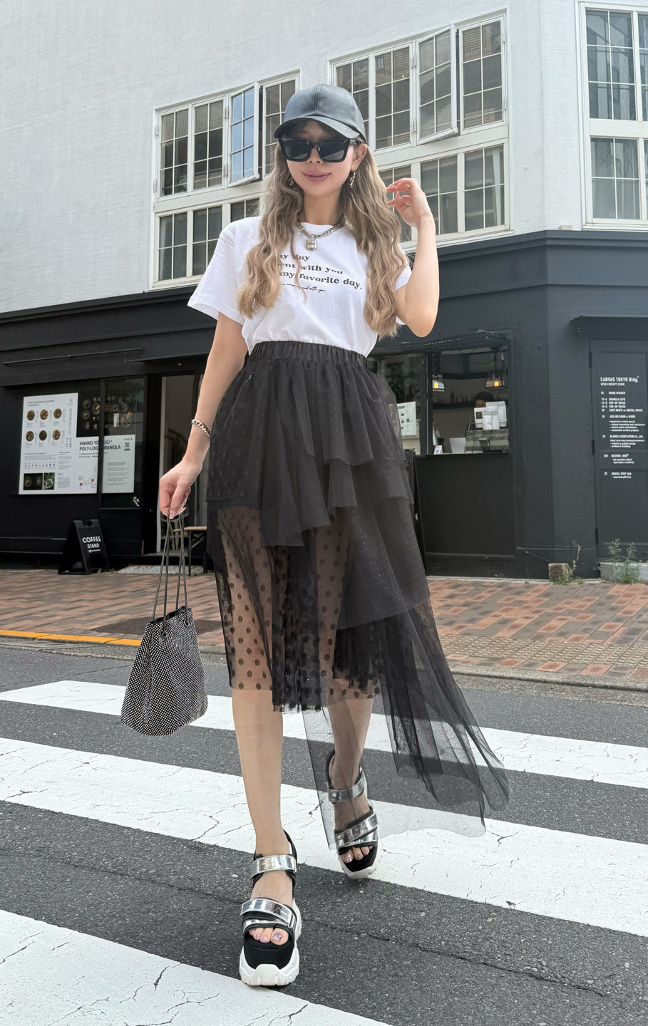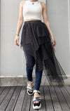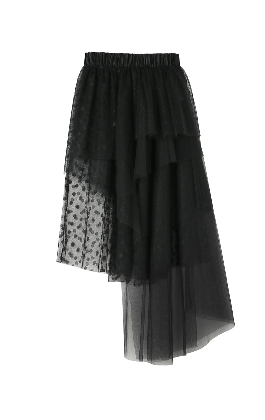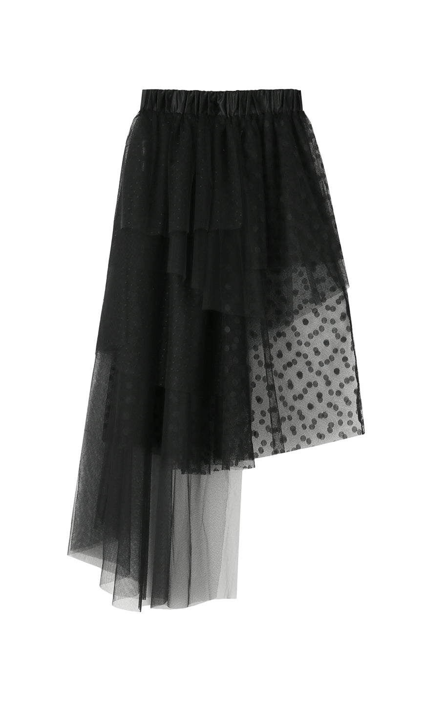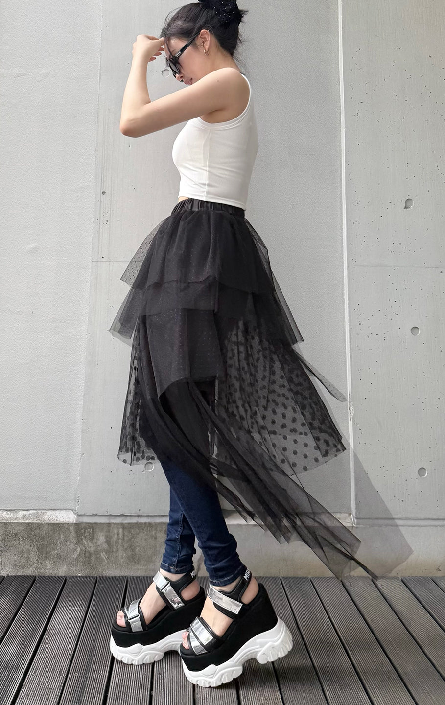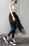 Asymmetrical tulle skirt. You can wear it over your favorite innerwear. Coordinate it with skinny pants or short bottoms. Can be worn casually or dressily. Elastic waistband can be adjusted all around.