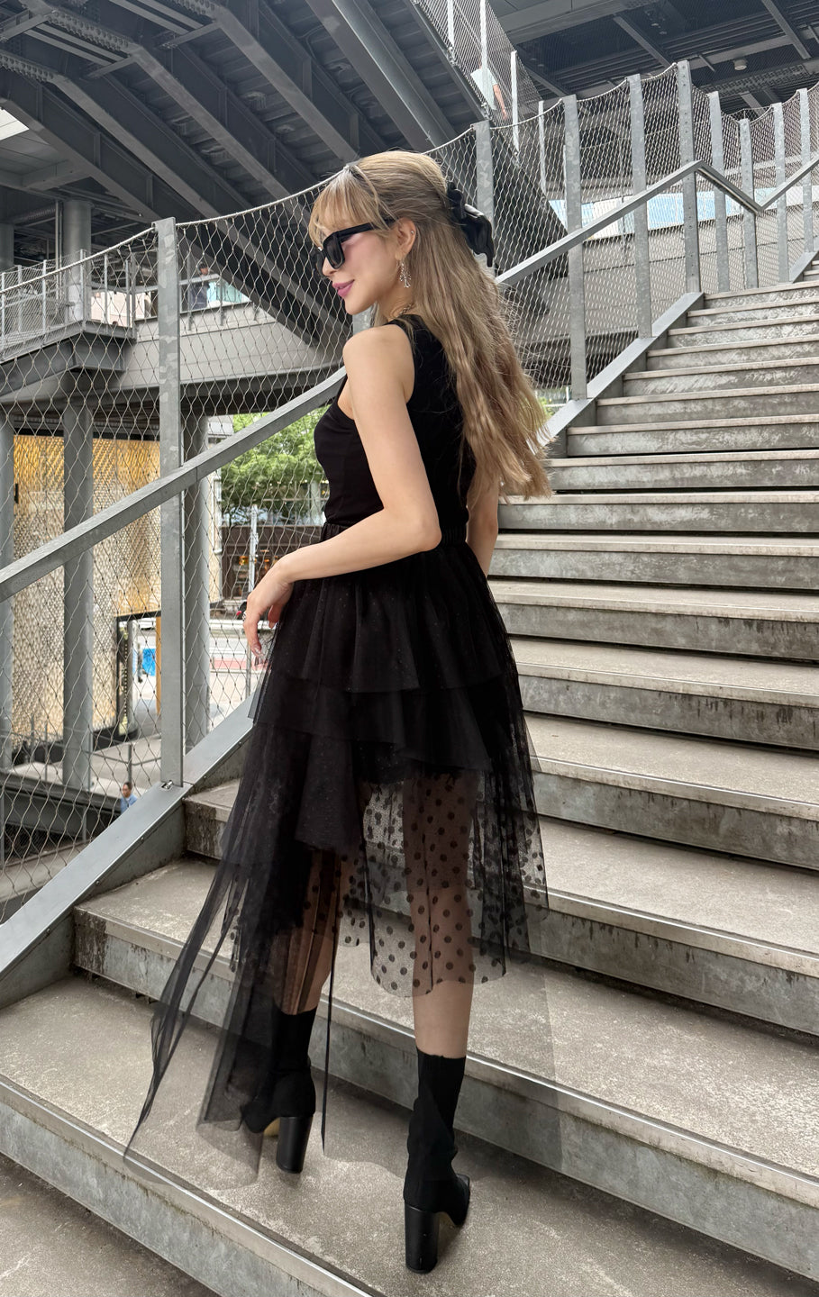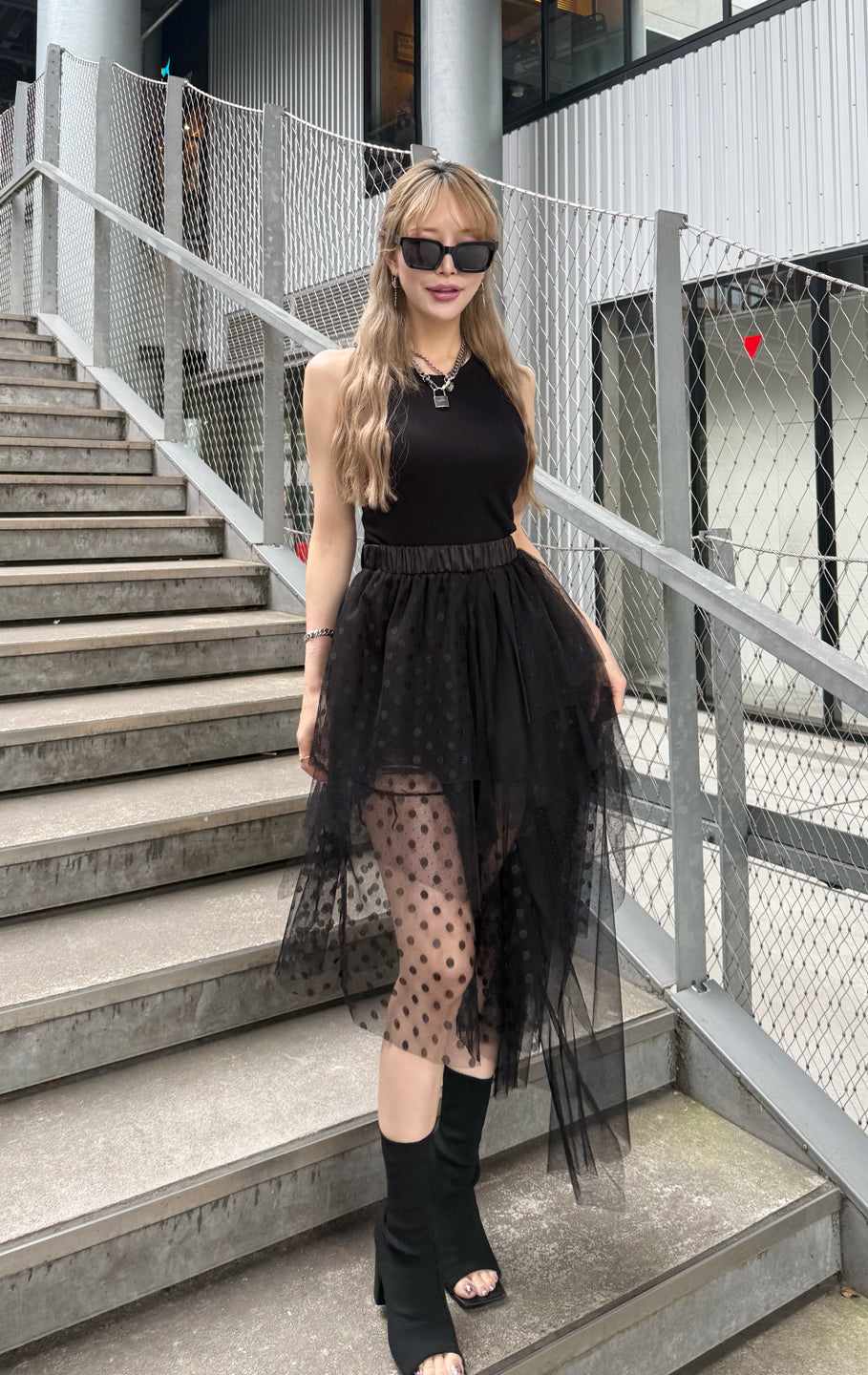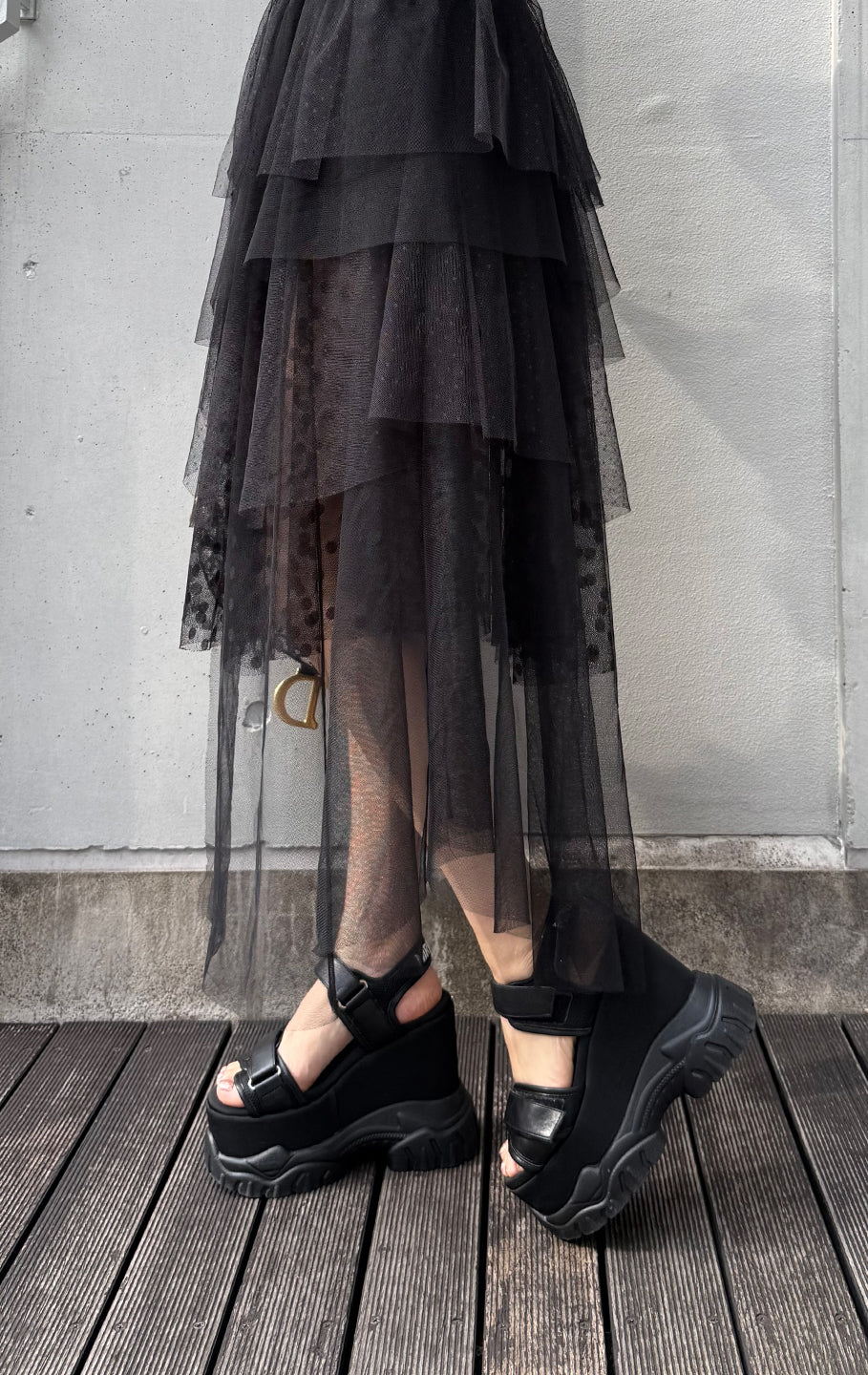 Asymmetrical tulle skirt. You can wear it over your favorite innerwear. Coordinate it with skinny pants or short bottoms. Can be worn casually or dressily. Elastic waistband can be adjusted all around.