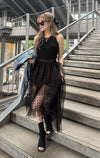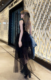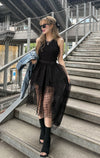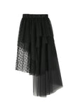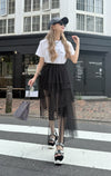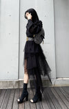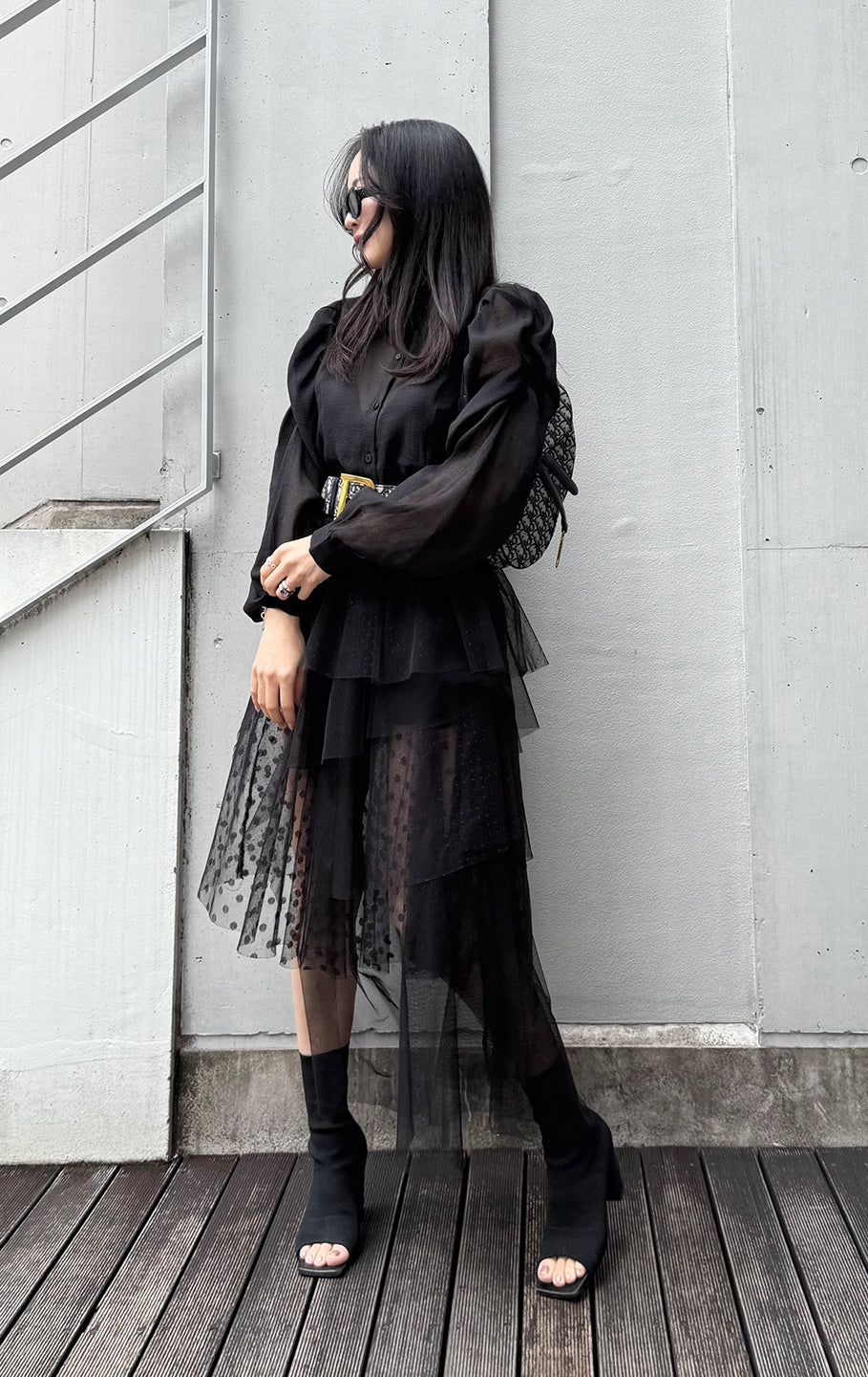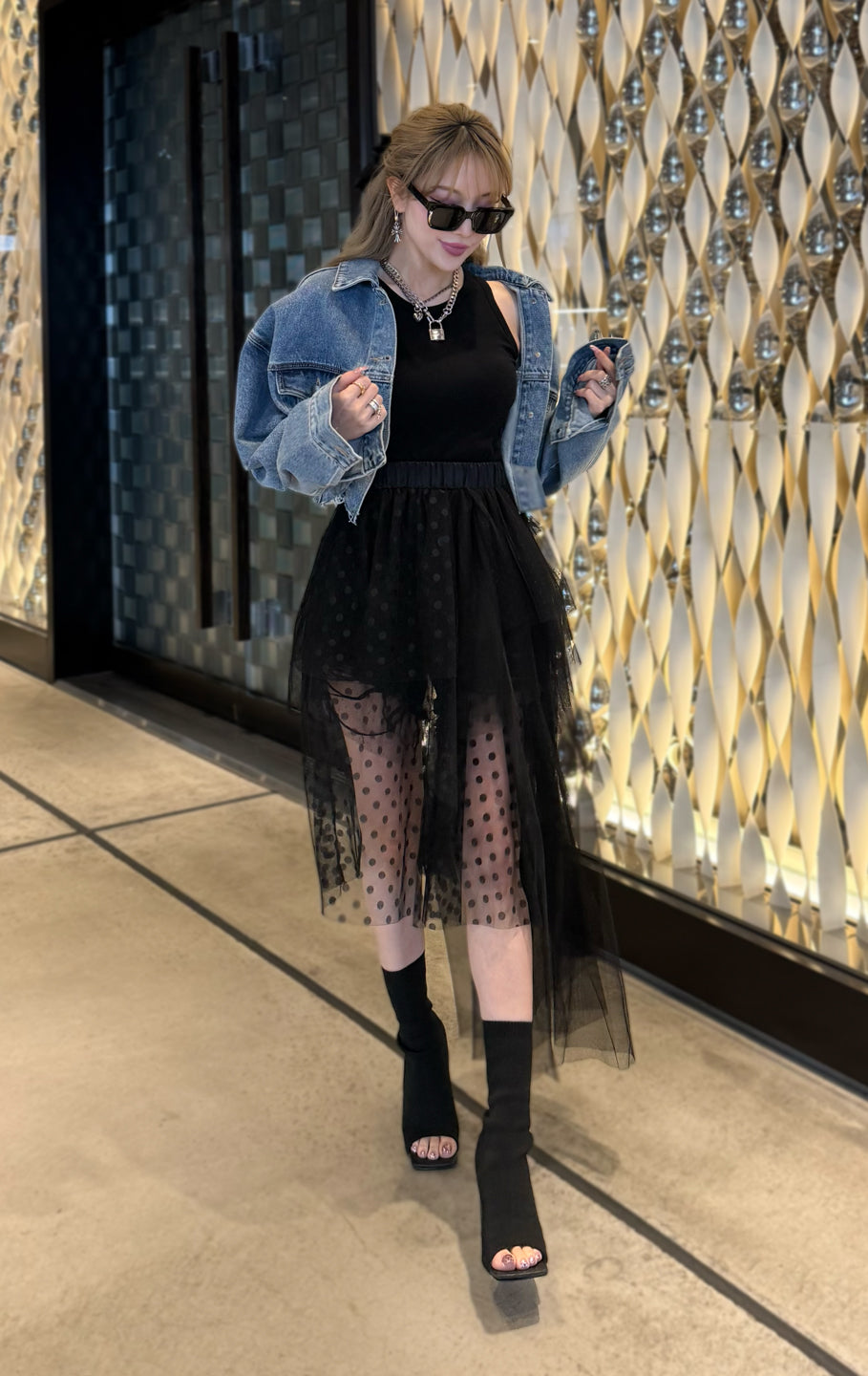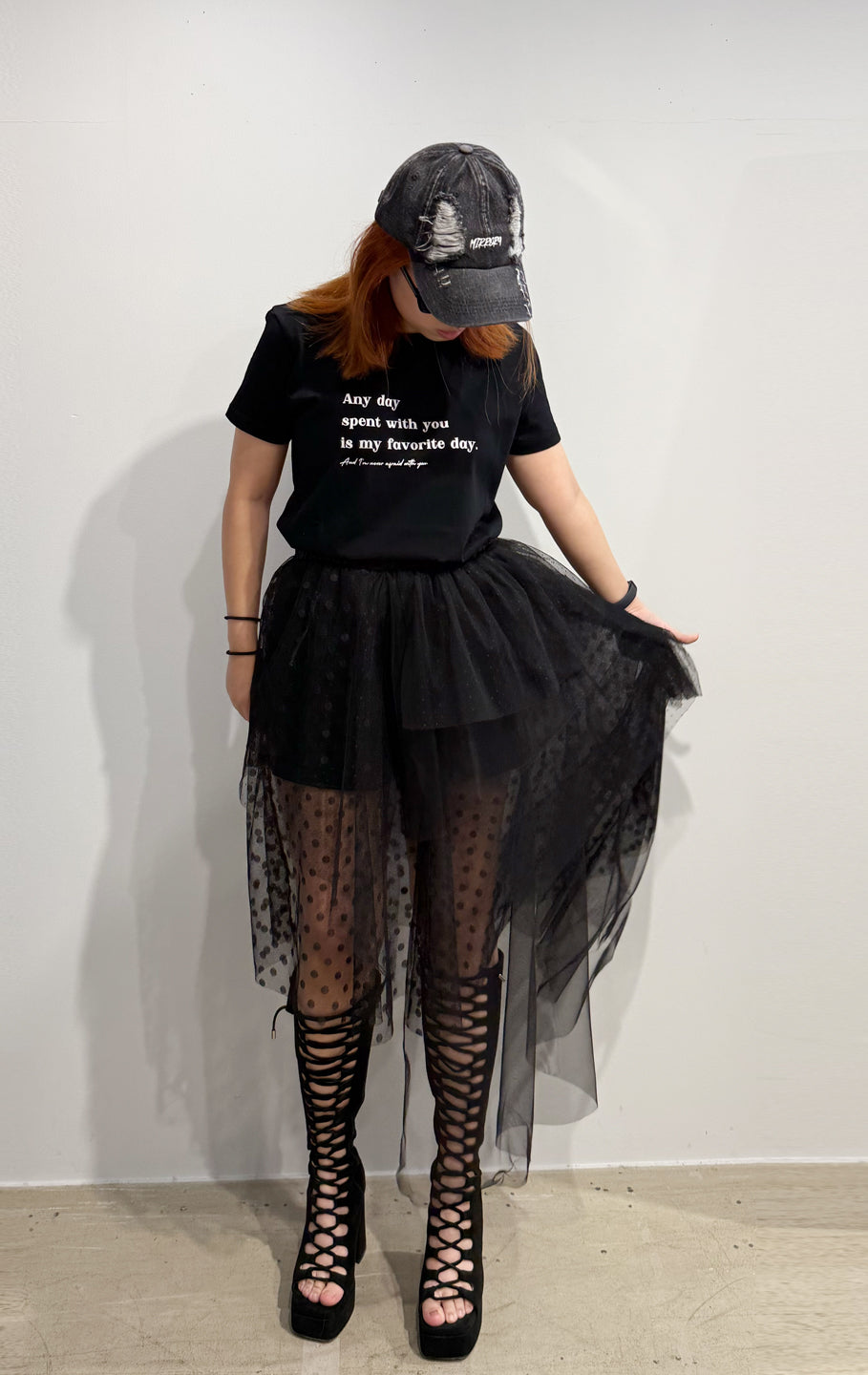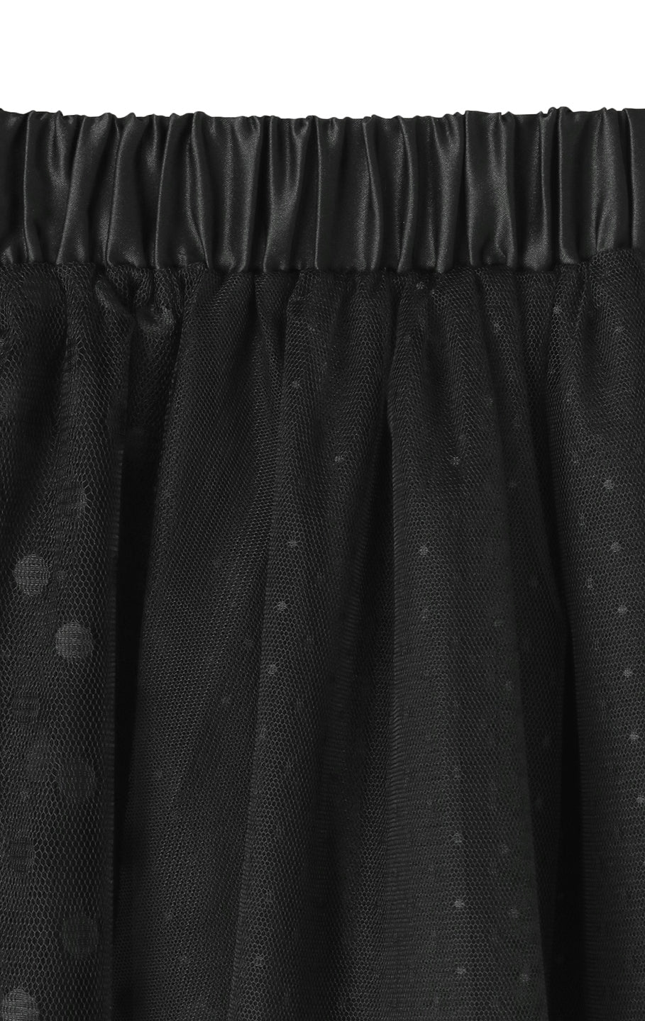 Asymmetrical tulle skirt. You can wear it over your favorite innerwear. Coordinate it with skinny pants or short bottoms. Can be worn casually or dressily. Elastic waistband can be adjusted all around.