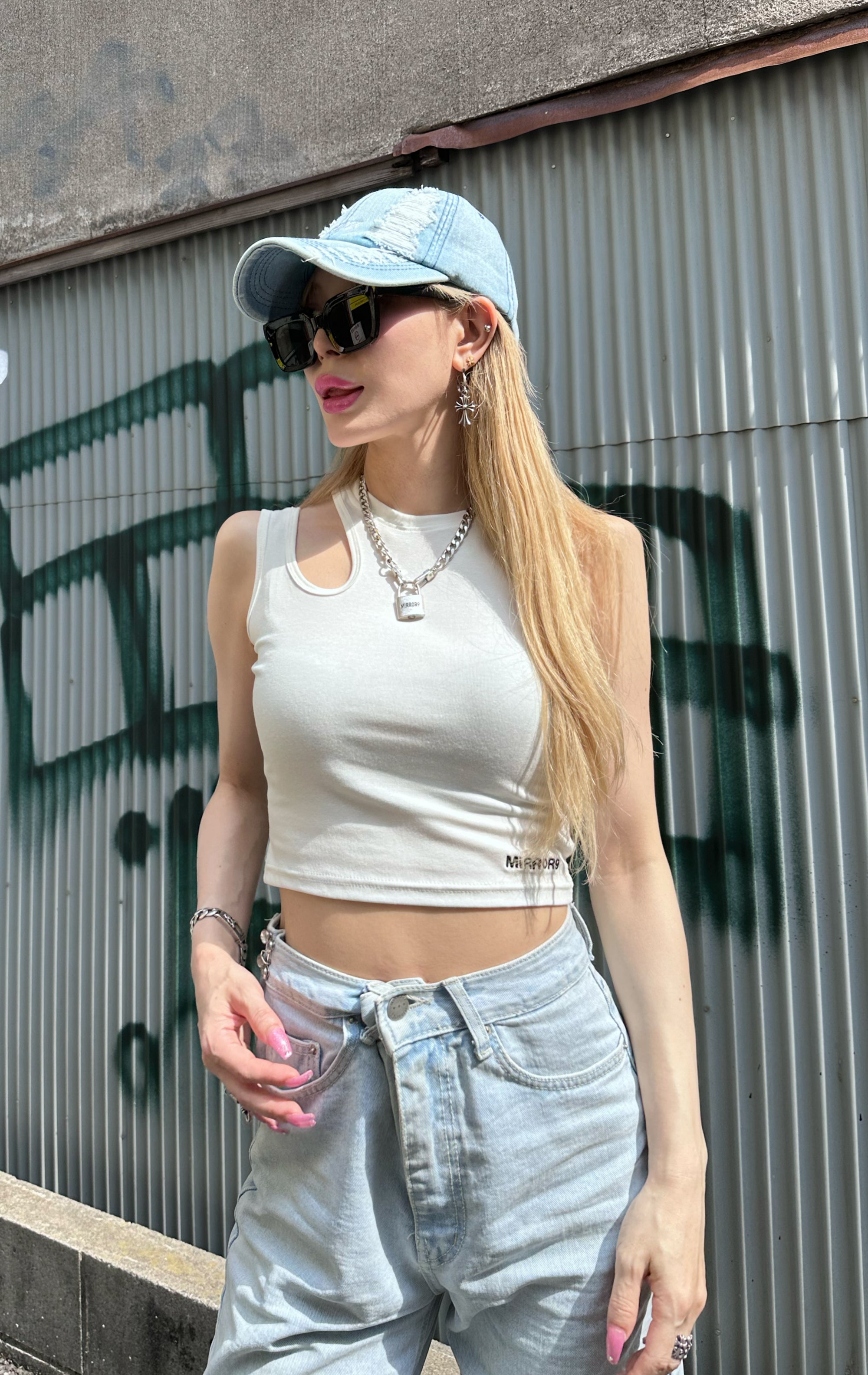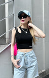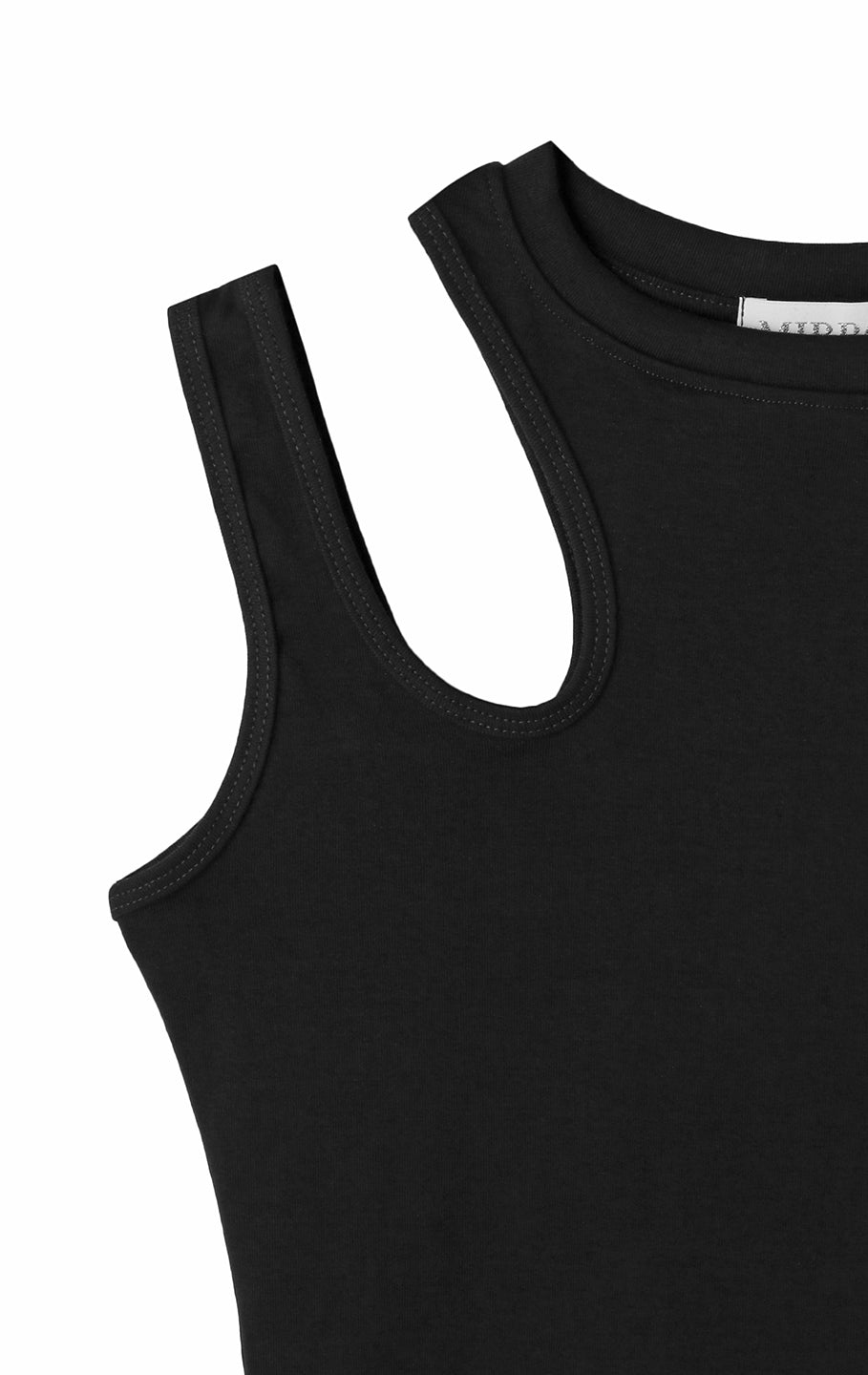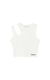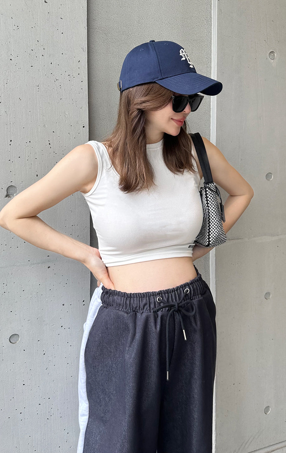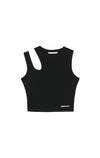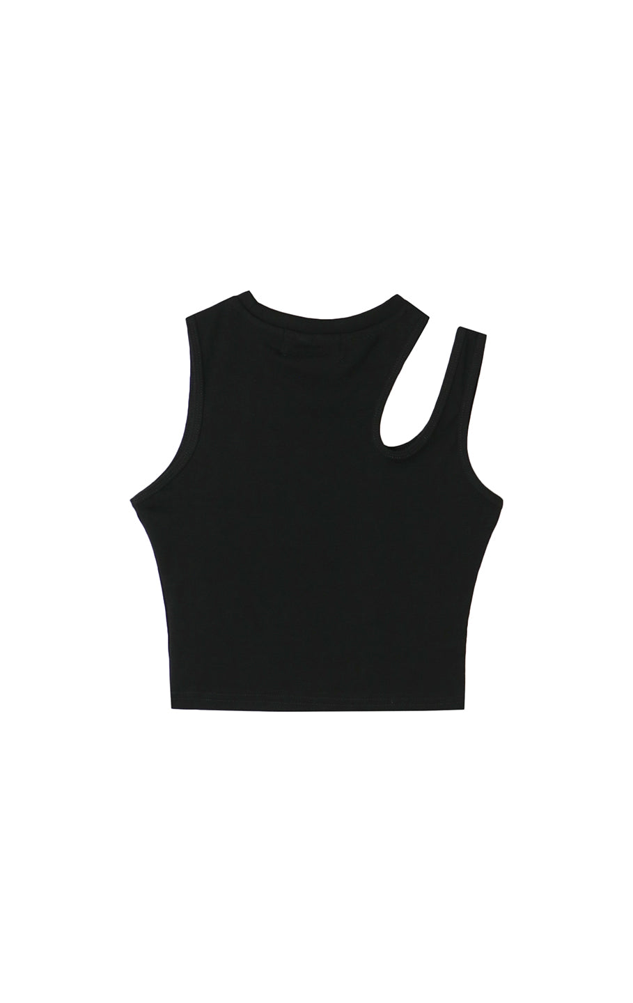 This sleeveless top is made from highly stretchable cut and sewn fabric. The cutting design is placed in a position that hides the shoulder straps of the inner layer, so you can wear it with confidence. Logo embroidered on the bottom right.
