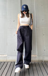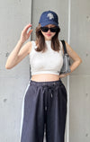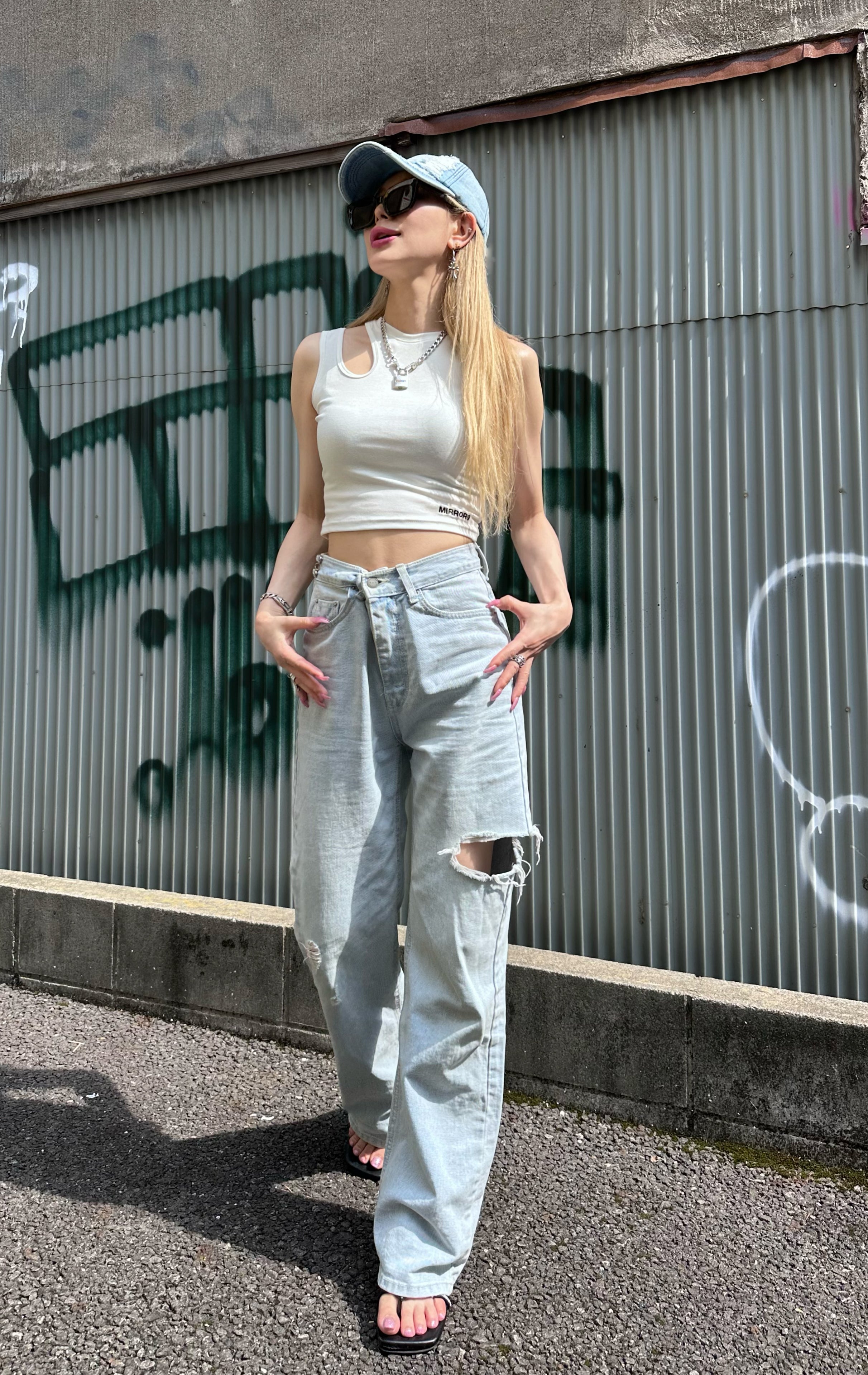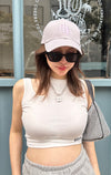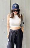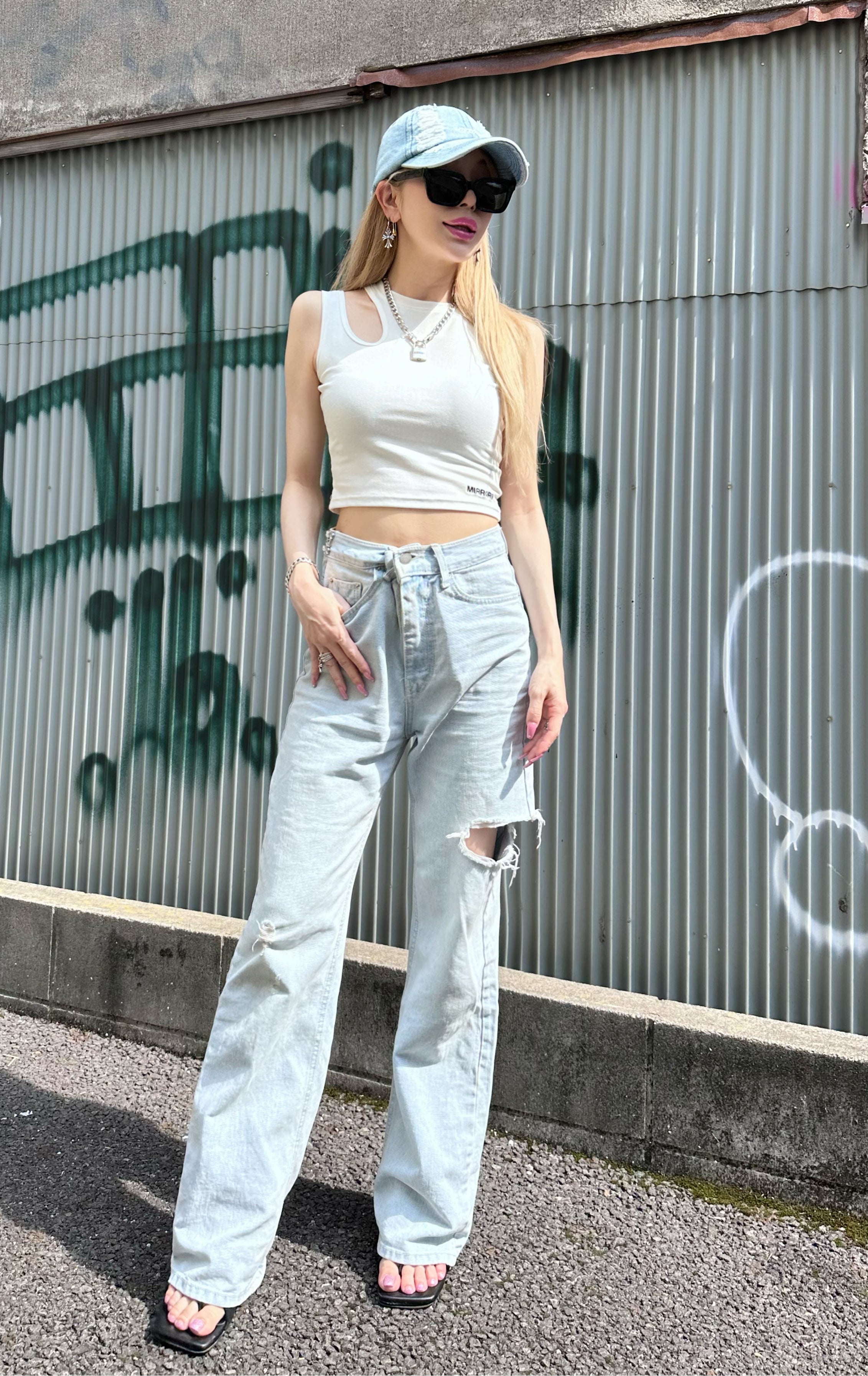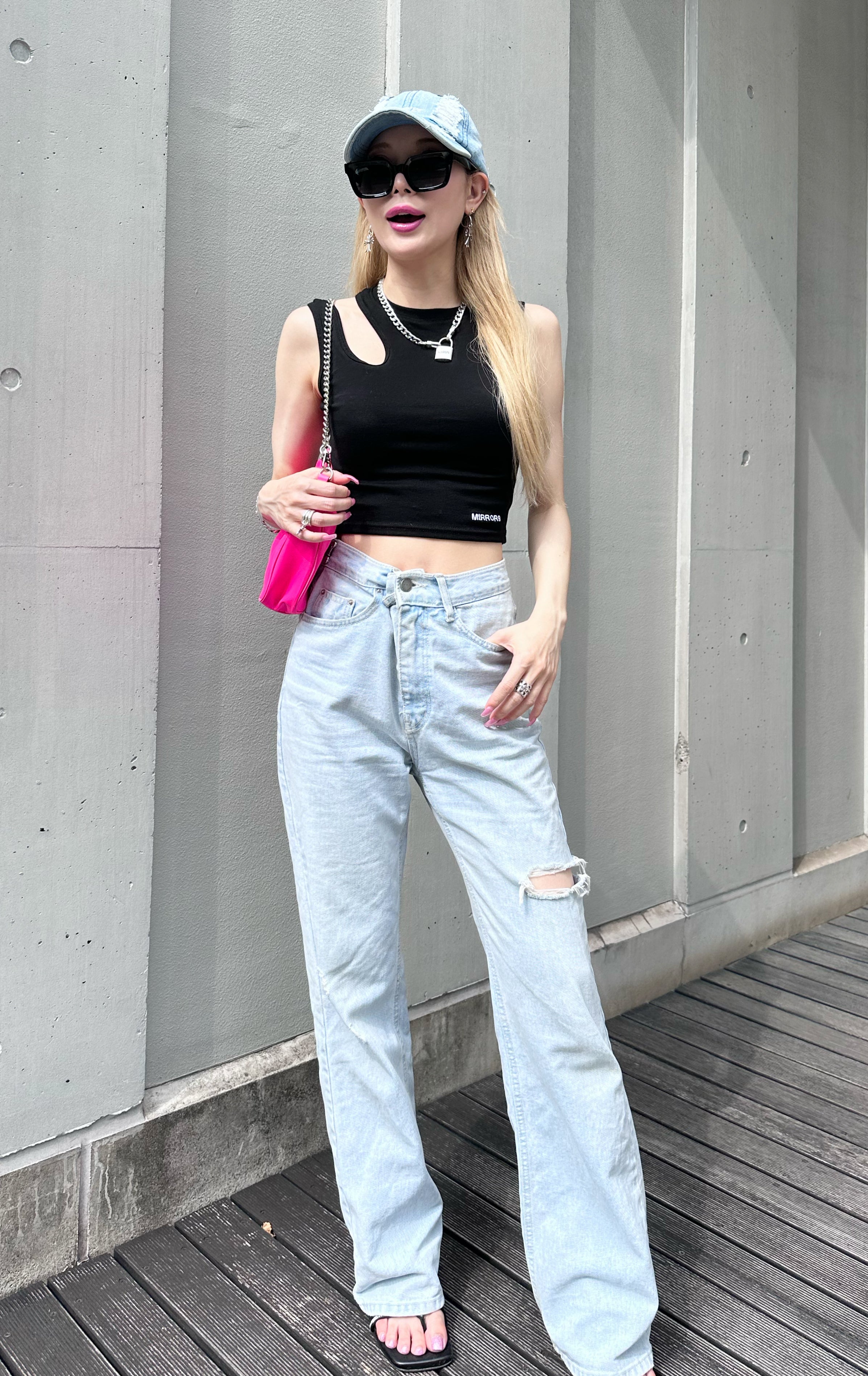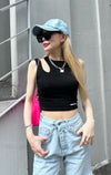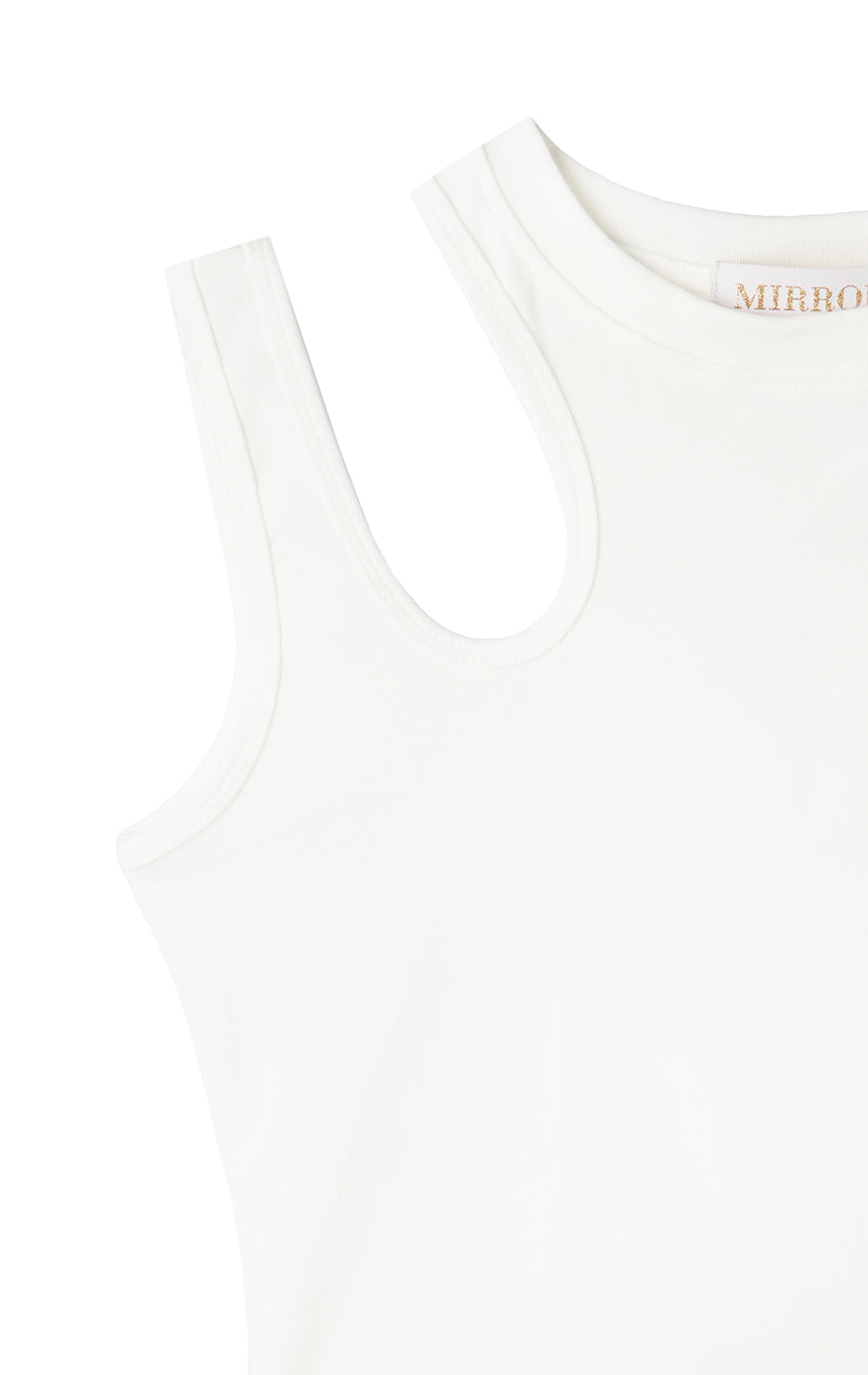This sleeveless top is made from highly stretchable cut and sewn fabric. The cutting design is placed in a position that hides the shoulder straps of the inner layer, so you can wear it with confidence. Logo embroidered on the bottom right.