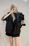 身長150㎝前後でお尻はすっぽり隠れ袖丈は肘より少し下になるサイズ感でした。
