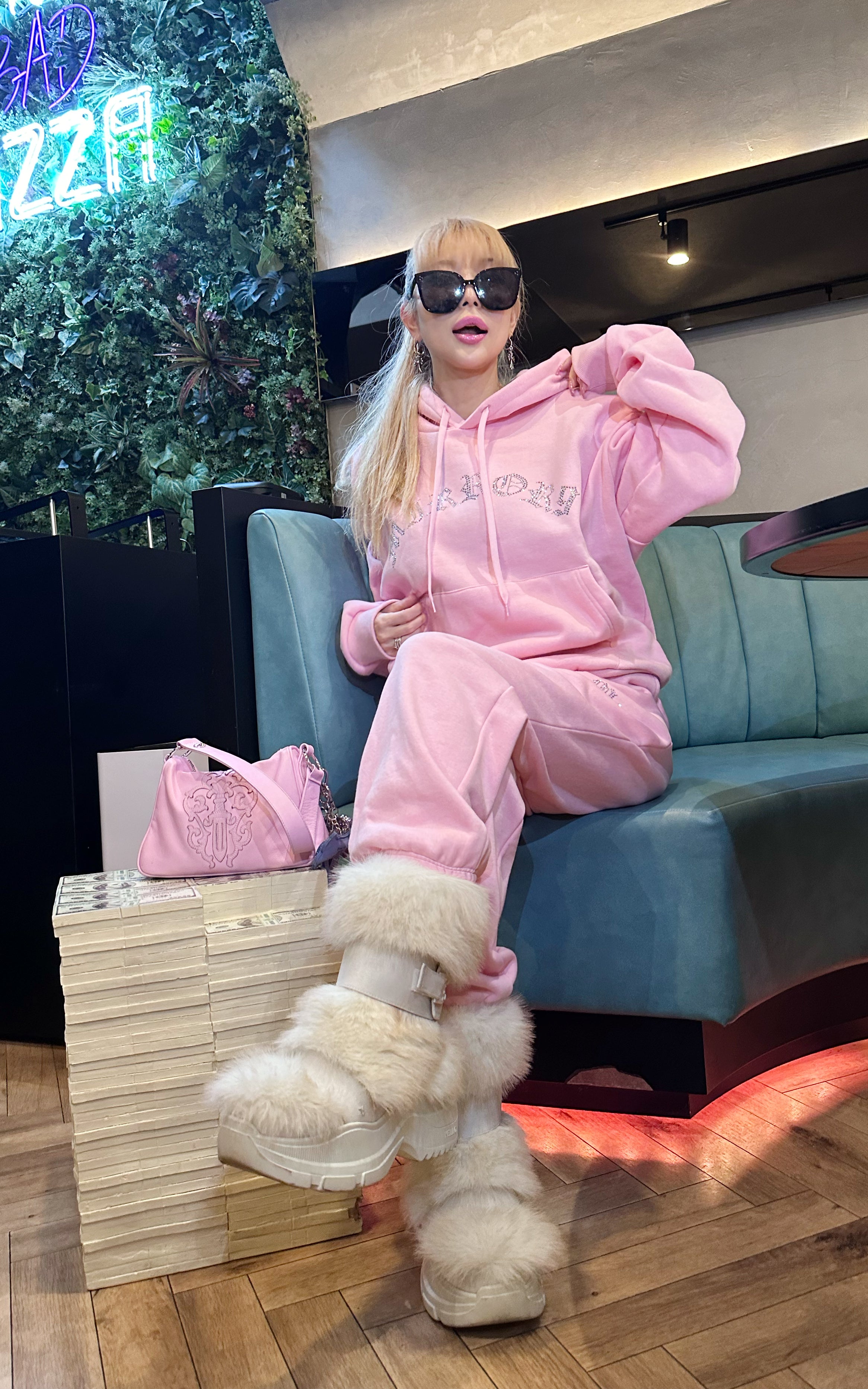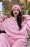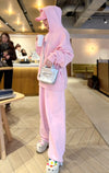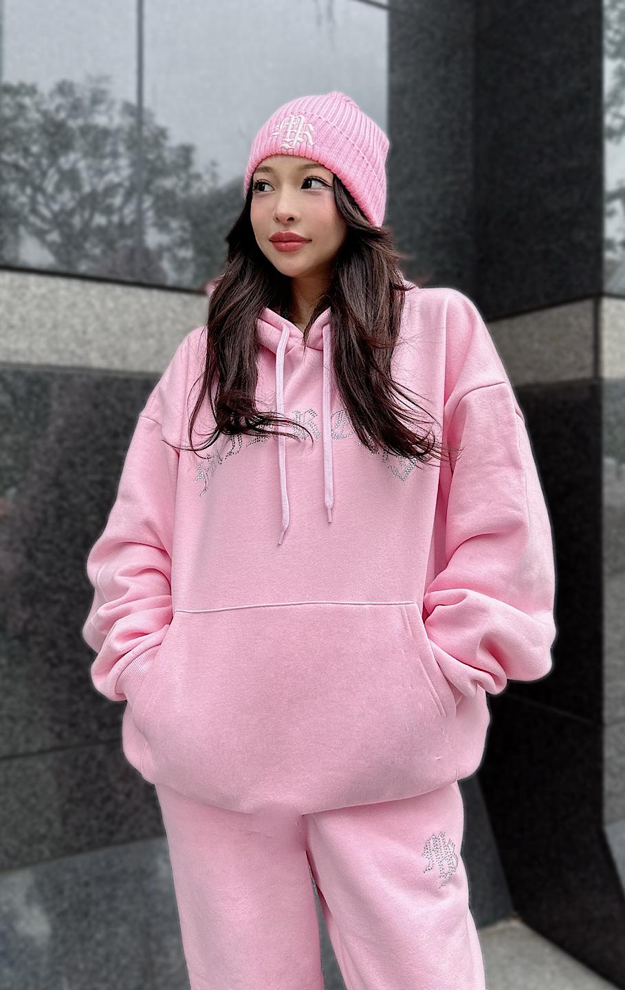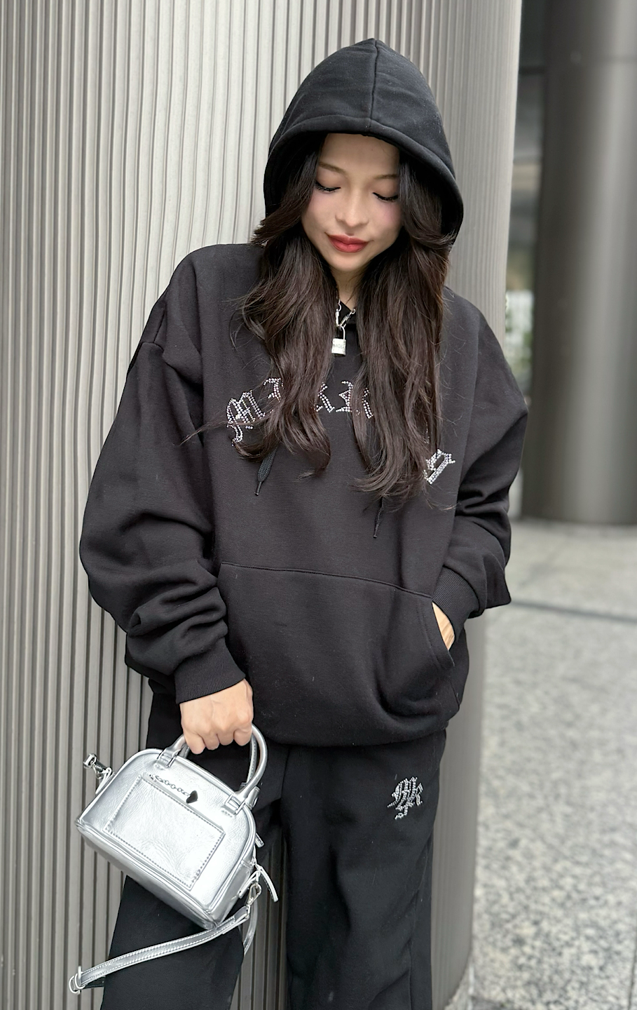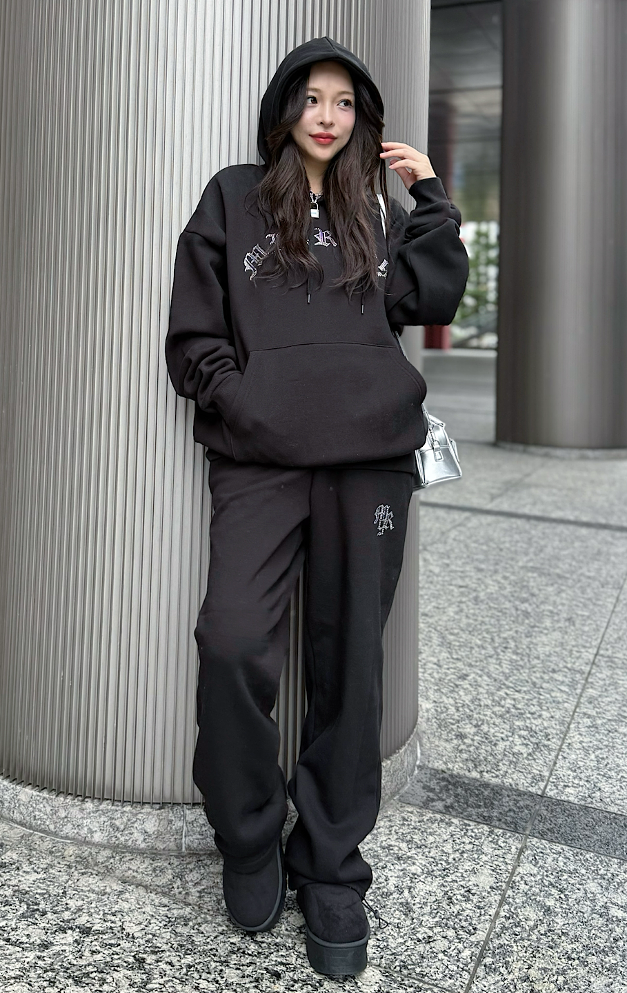 パーカーも着丈が長いので、私の身長だとパンツのキラキラが隠れてしまいますが、大きすぎておかしいって事もなくセットアップとして着れます。