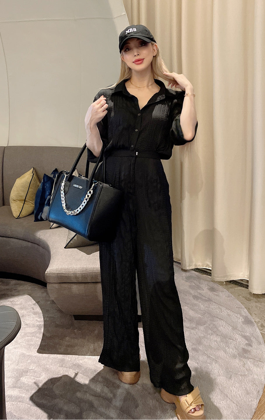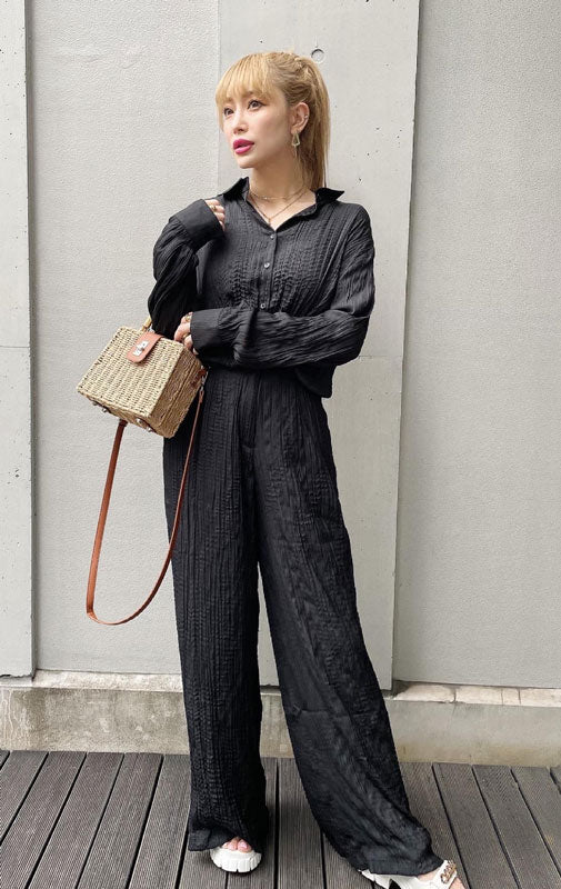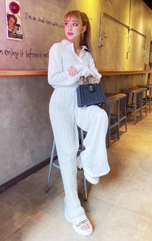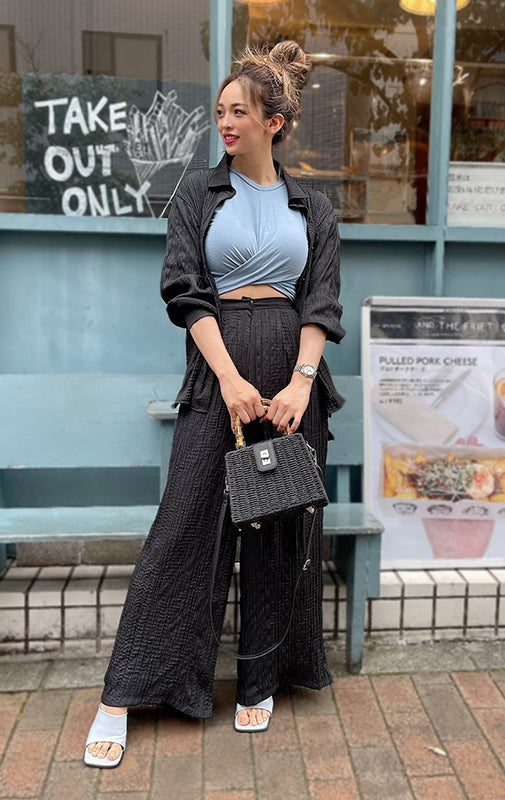 ちーさんのコーデで買いました⭐︎前開けてクーラー寒い時の羽織みたいにもつかえるしパンツは後ろゴムなので少しお腹がきになる私でも大丈夫でした!セットアップで着れるのでコーデすぐきまって楽です。ホワイトも検討中です。