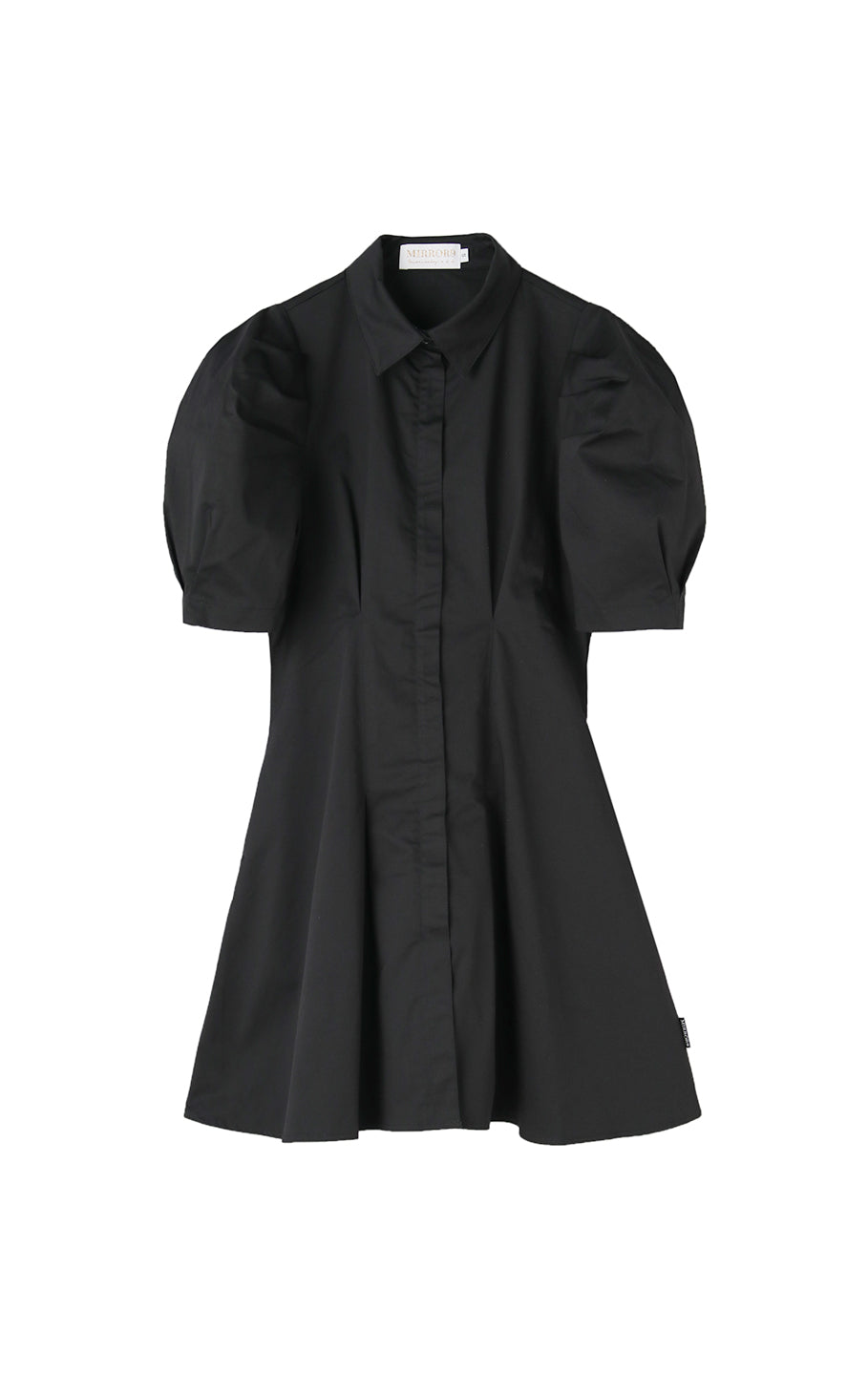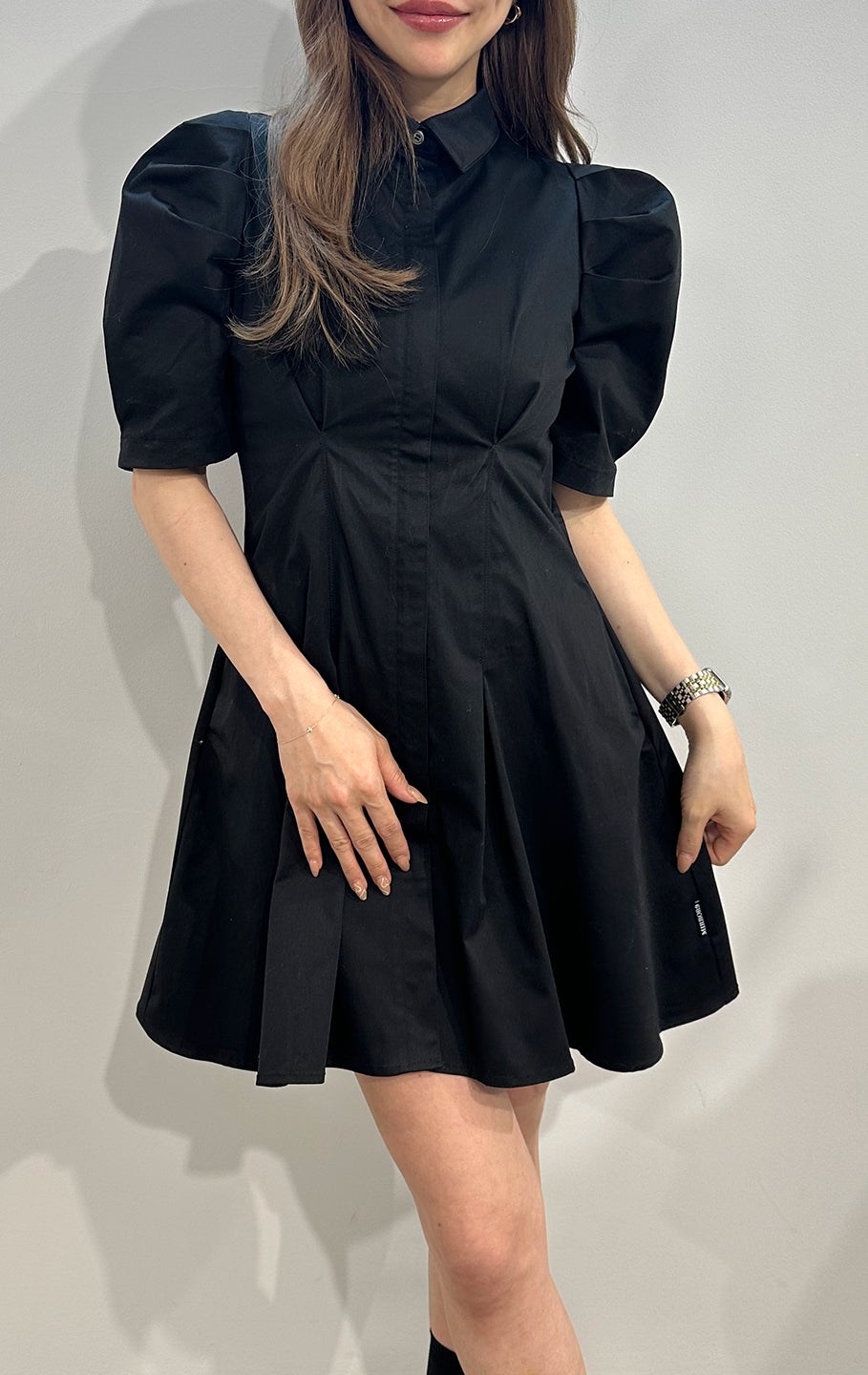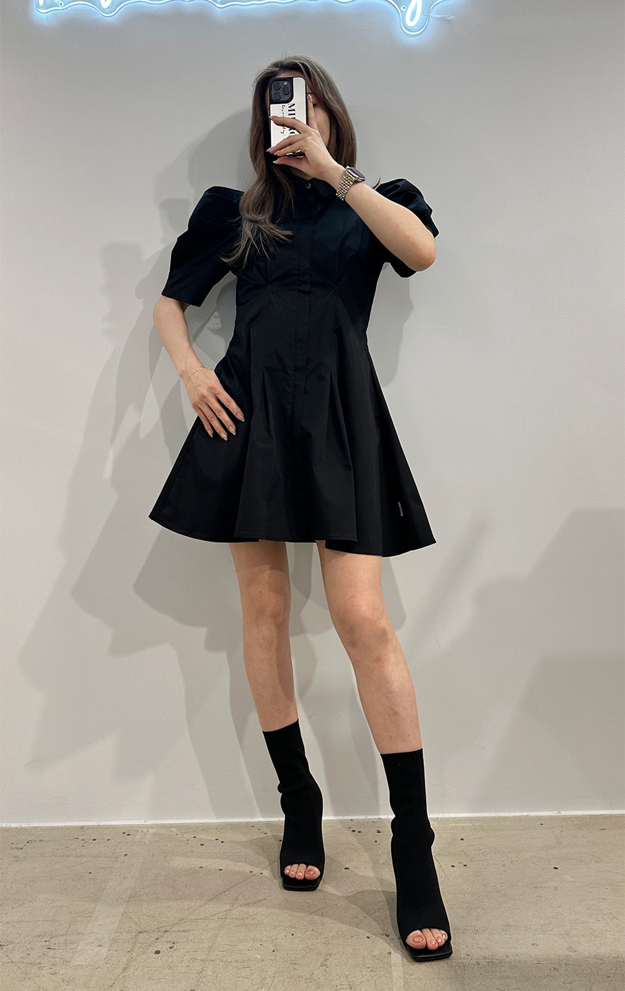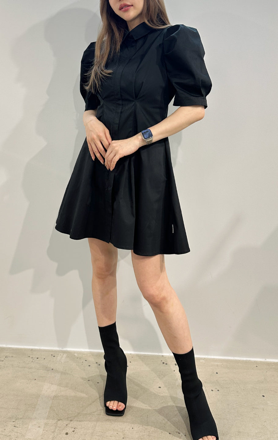 A shirt dress made of sturdy fabric. The front can be opened and closed with a zipper below the top button. We pursued ease of wear. The shirred puff sleeves make your arms look slender, and the flared silhouette from the waist to the skirt makes your waist and legs look slender, so you can enhance your style just by wearing it.
