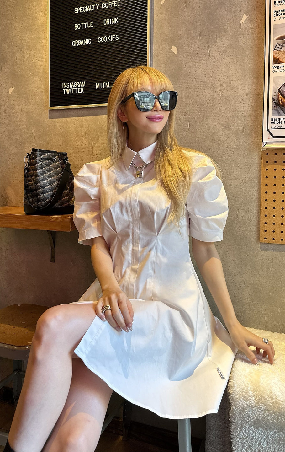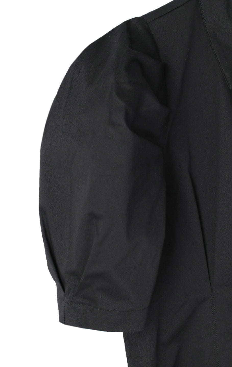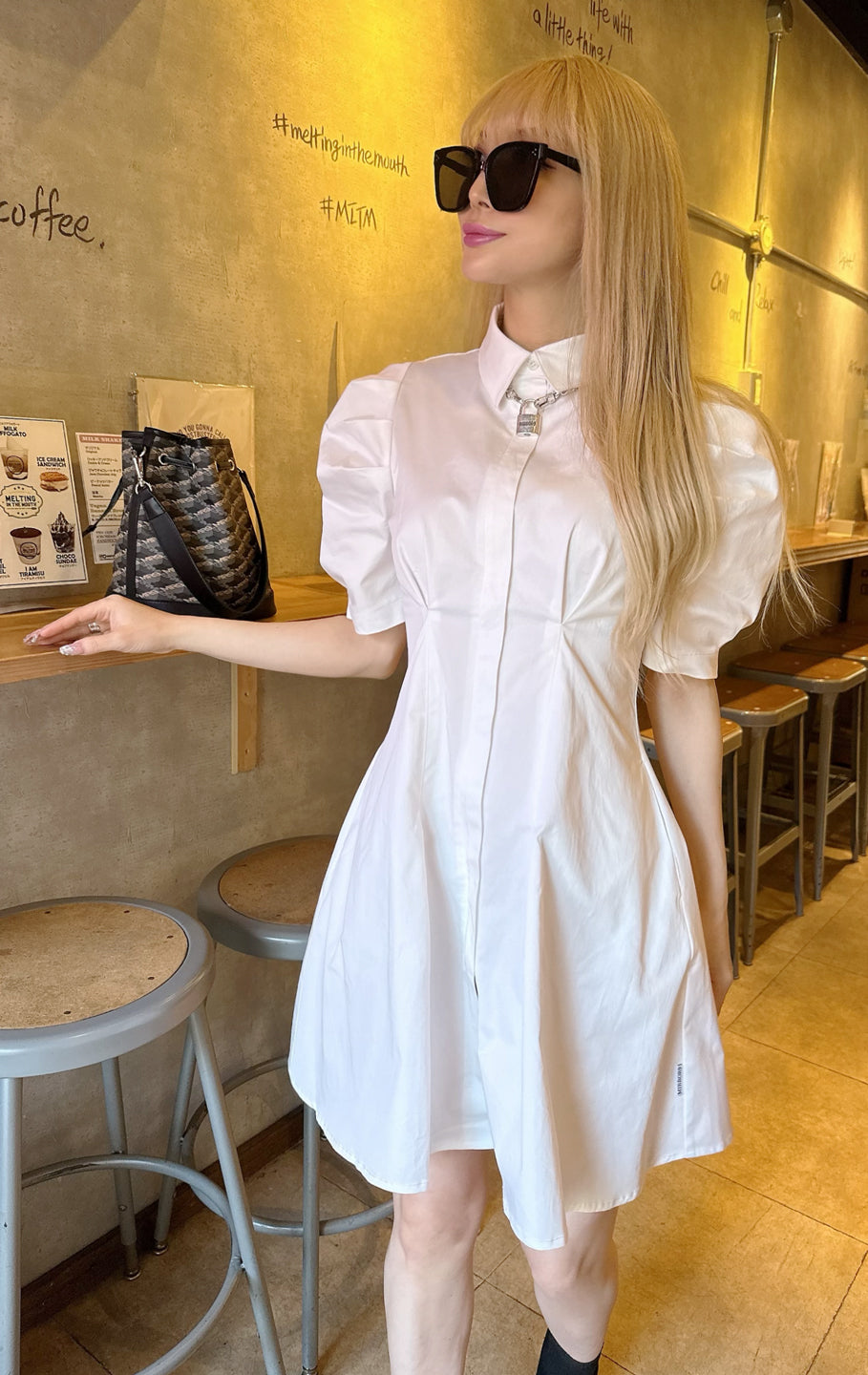 A shirt dress made of sturdy fabric. The front can be opened and closed with a zipper below the top button. We pursued ease of wear. The shirred puff sleeves make your arms look slender, and the flared silhouette from the waist to the skirt makes your waist and legs look slender, so you can enhance your style just by wearing it.