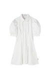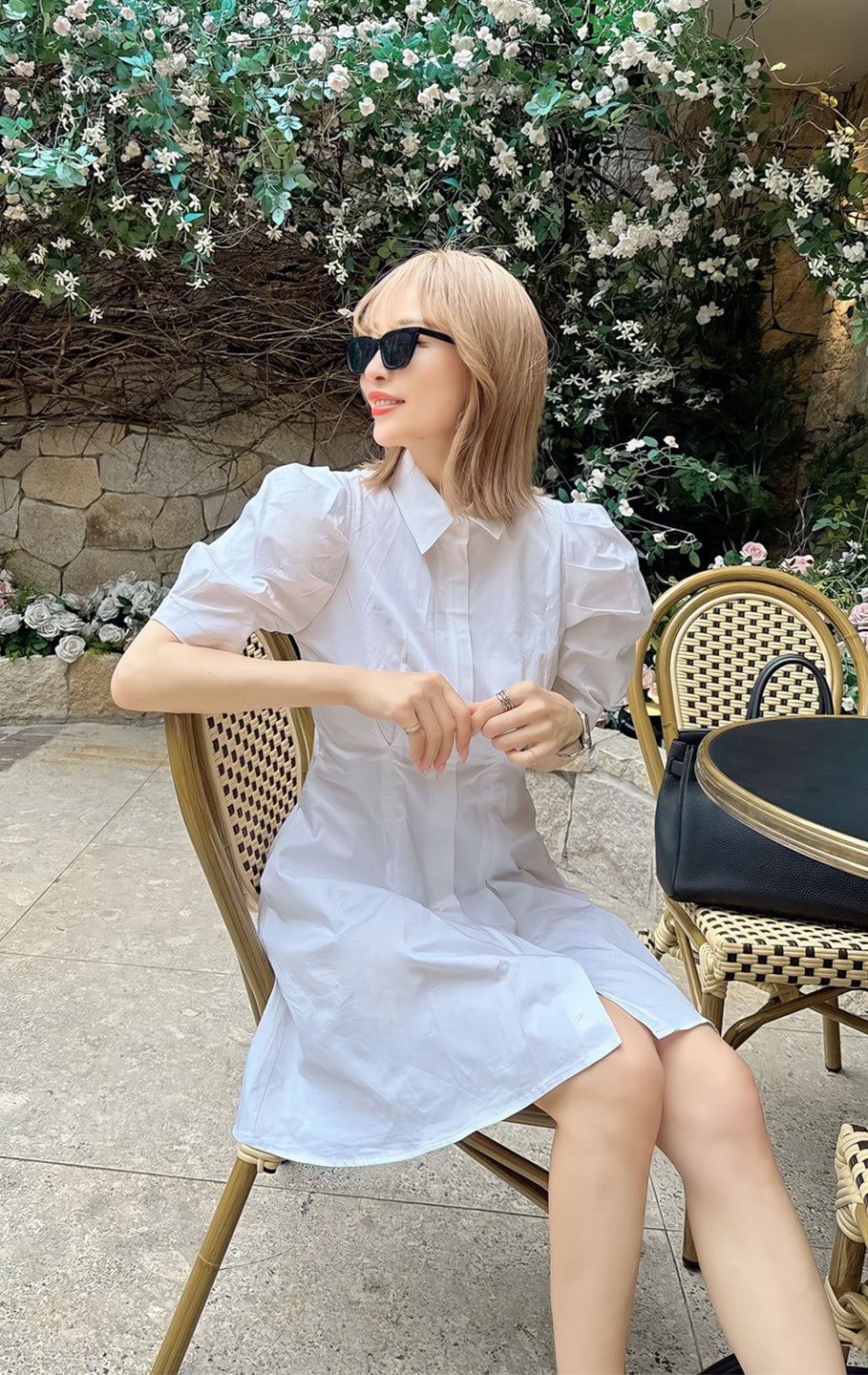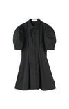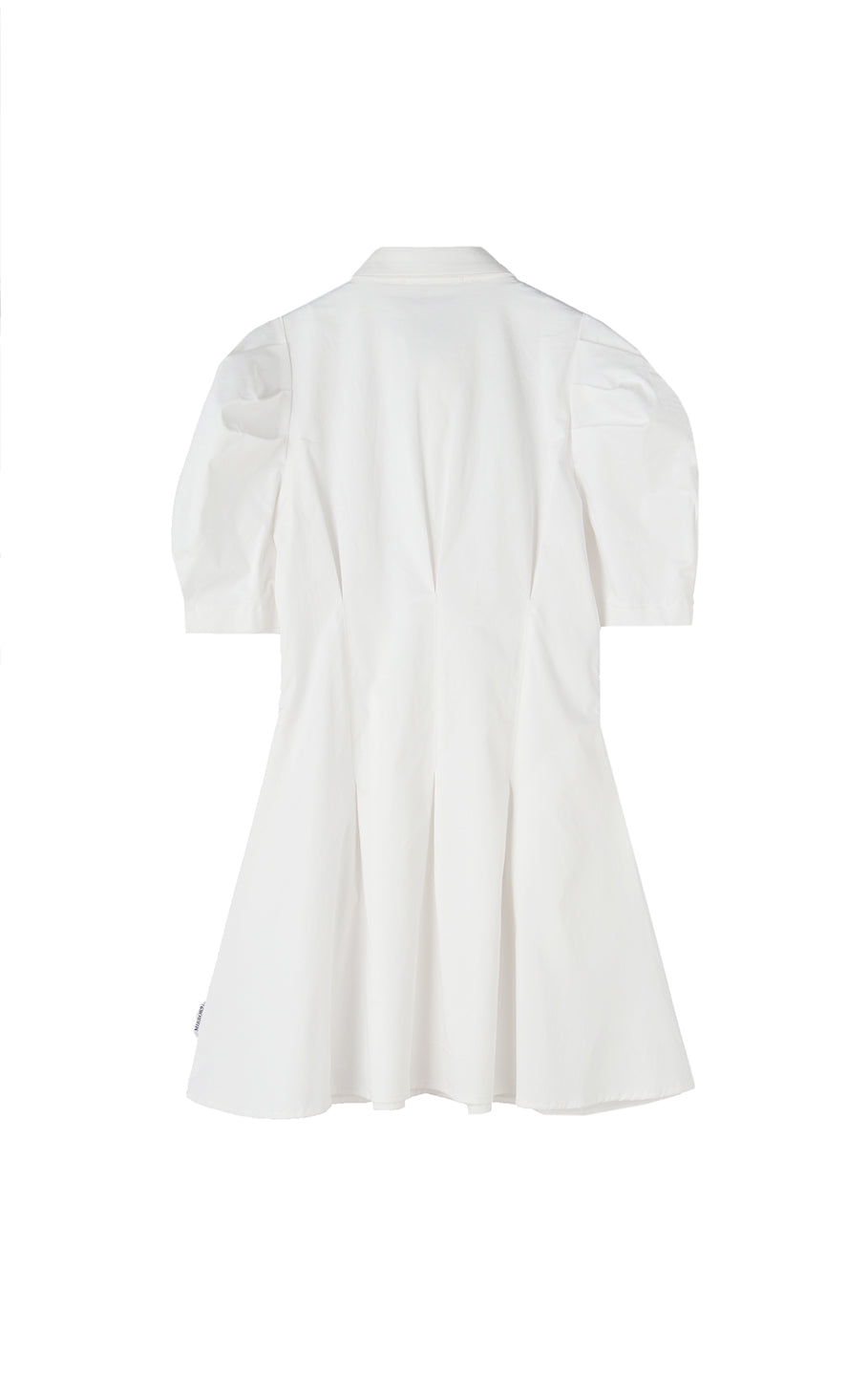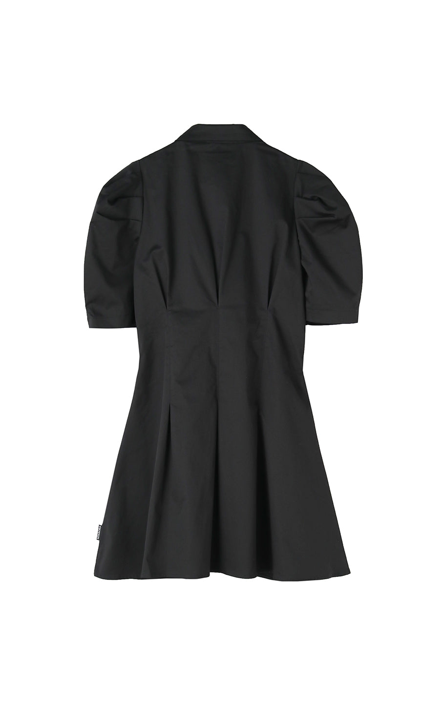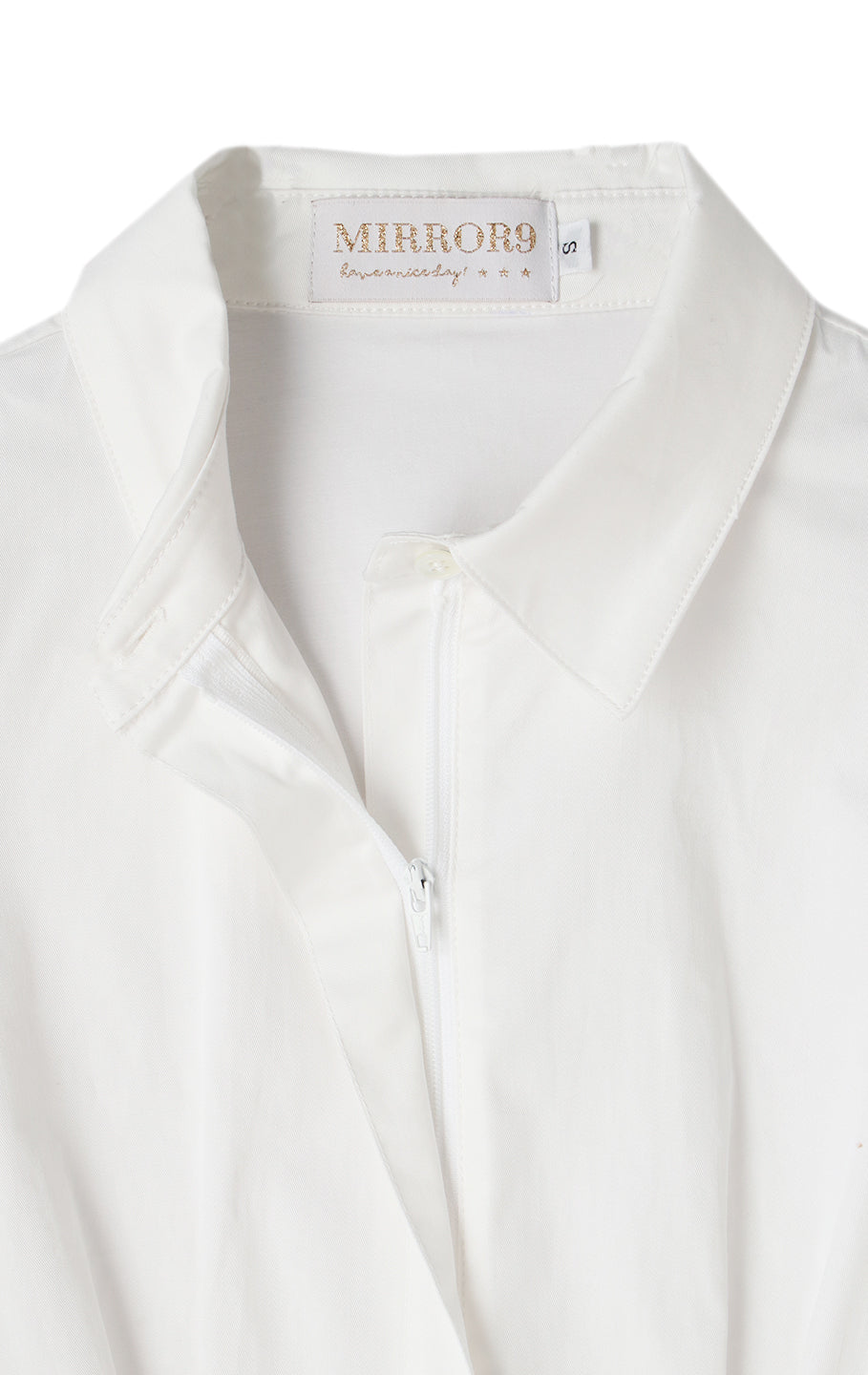 A shirt dress made of sturdy fabric. The front can be opened and closed with a zipper below the top button. We pursued ease of wear. The shirred puff sleeves make your arms look slender, and the flared silhouette from the waist to the skirt makes your waist and legs look slender, so you can enhance your style just by wearing it.