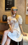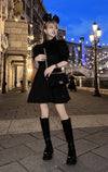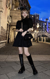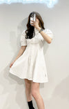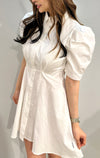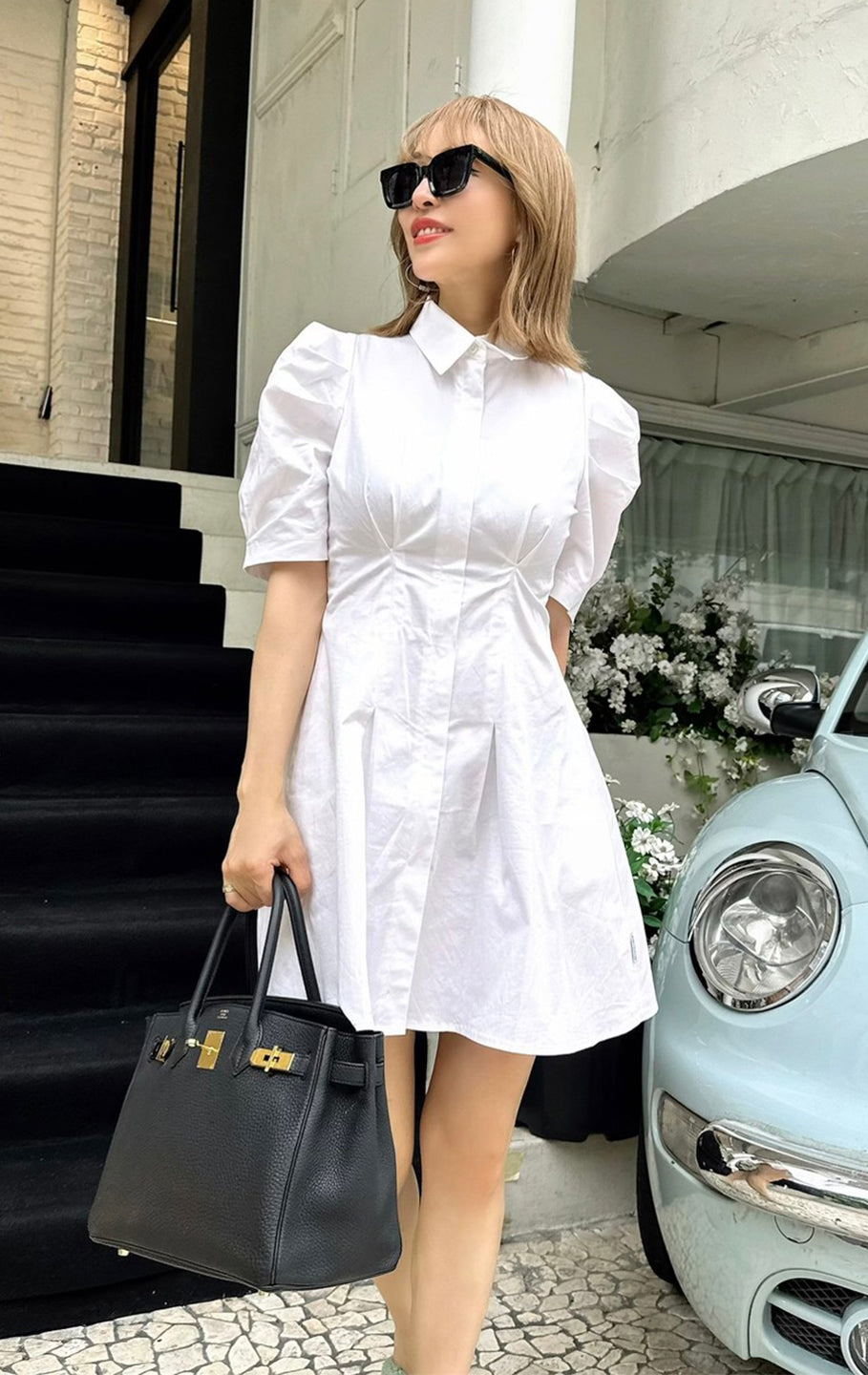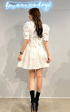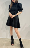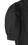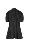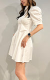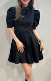 袖のシャーリングのパフスリーブで腕は細く、ウエストからスカートへのフレアシルエットでウエストと脚が細見えするよう計算されており、着るだけでスタイルアップ効果が望めます。