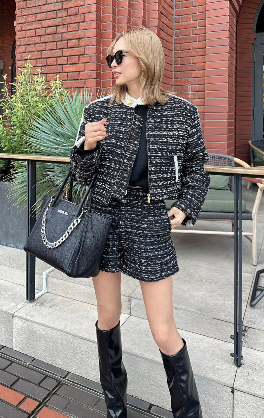 ベーシックなデザインで着回し力抜群なのはもちろん、表情のあるツイードでコーディネートに華やかさを持たせてくれる一枚です。