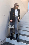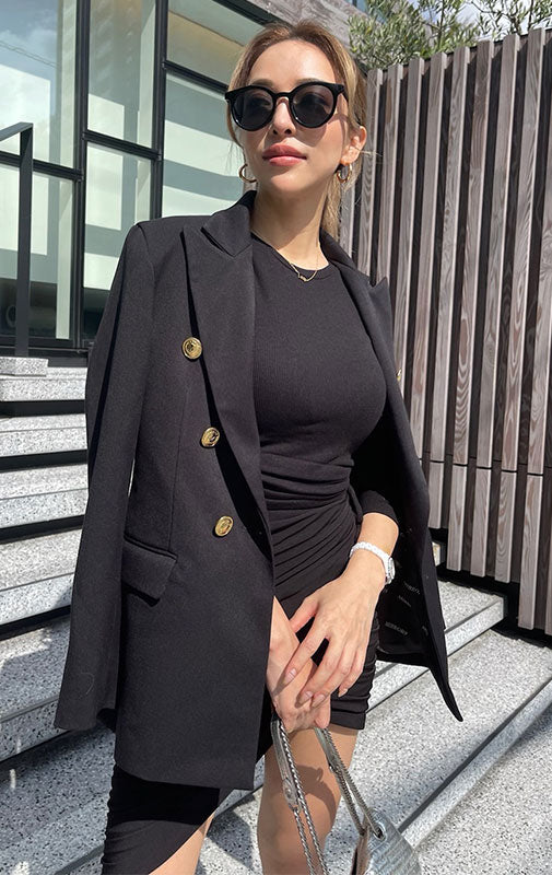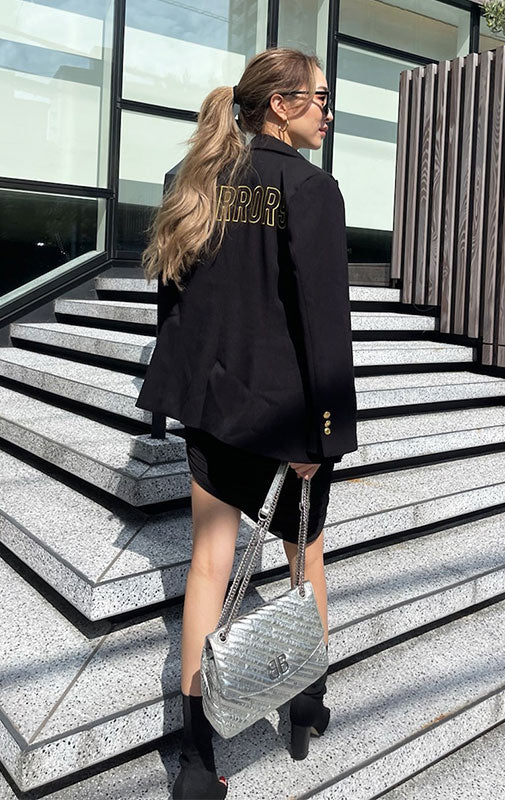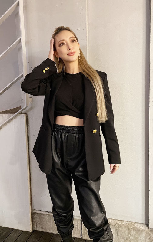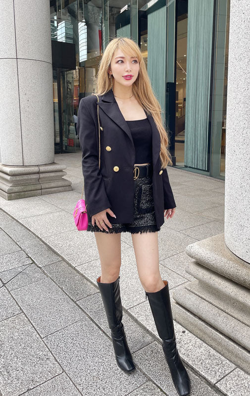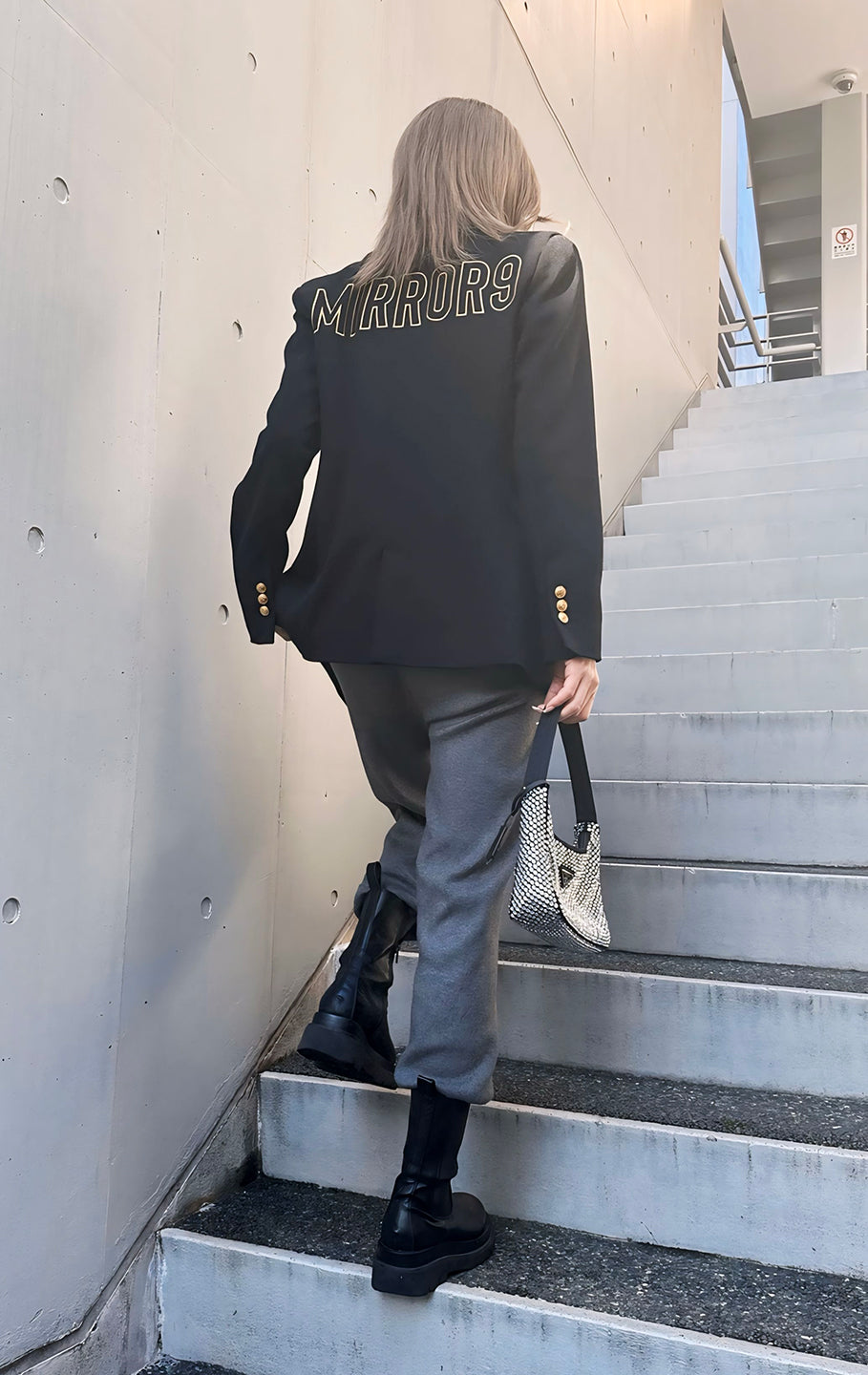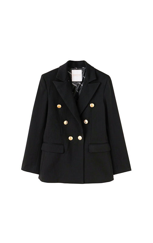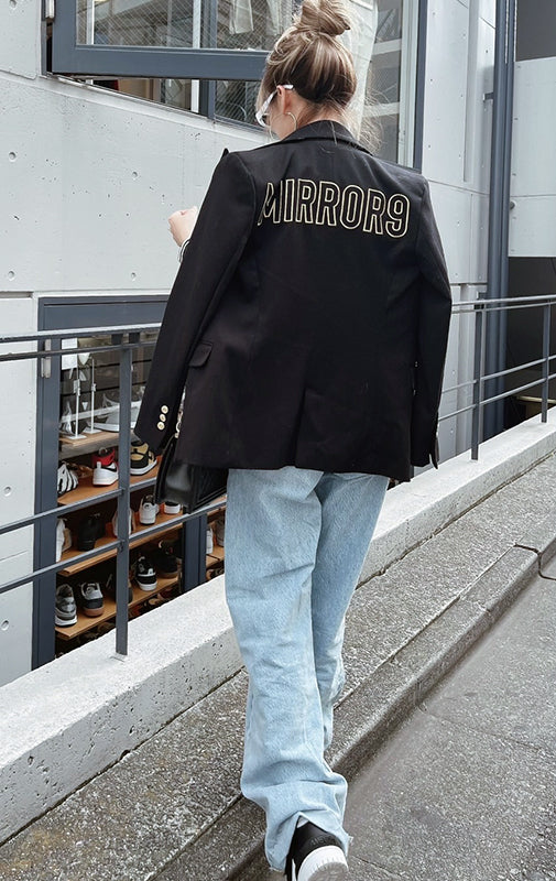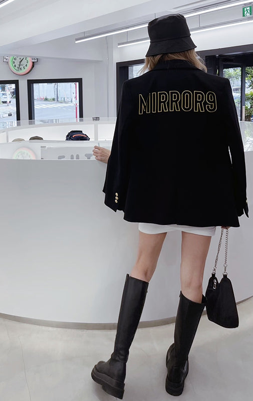 This double jacket has soft padding on the shoulders so anyone can create a beautiful silhouette. The back has a gold embroidered logo. The buttons are MIRROR9's original gold buttons. A classic silhouette that can be coordinated with a variety of situations if you have one.