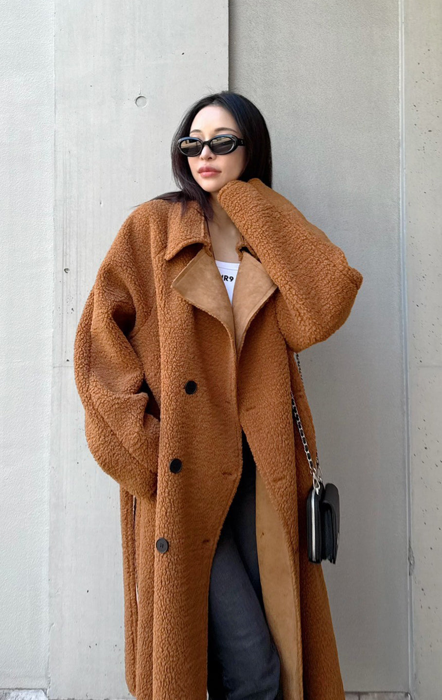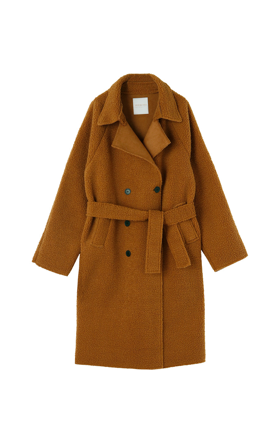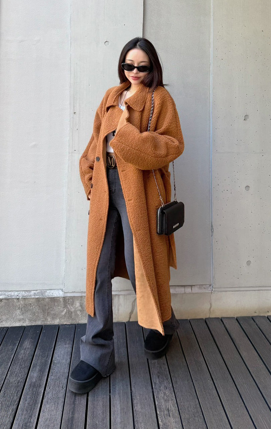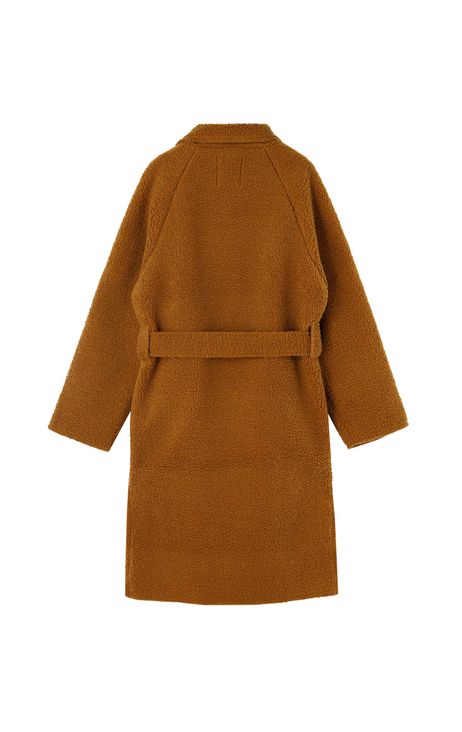 This is a boa fabric coat. Although it's lightweight, it's below-the-knee length and warm, and comes with a string that can be tied around the waist. There are pockets on both sides.