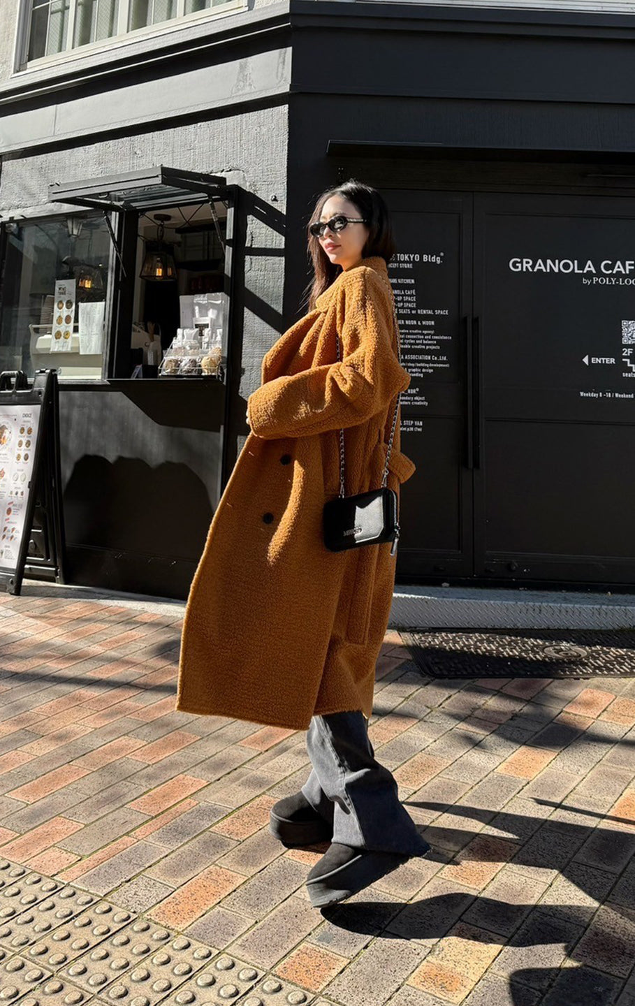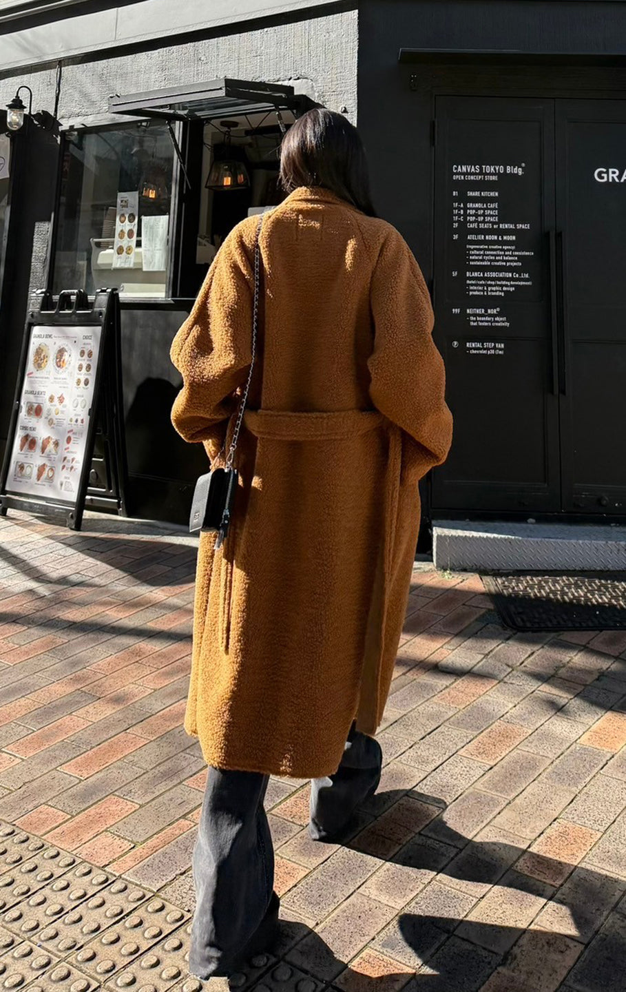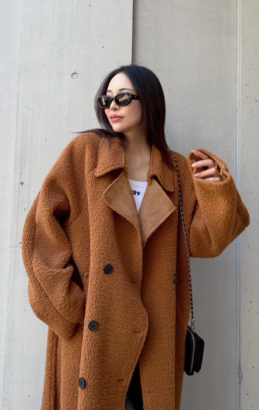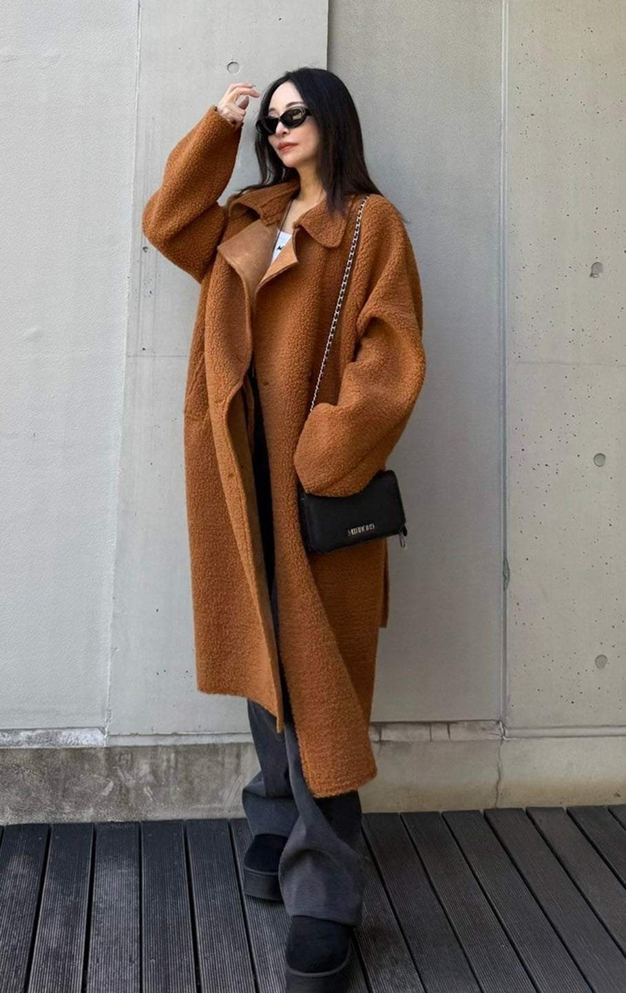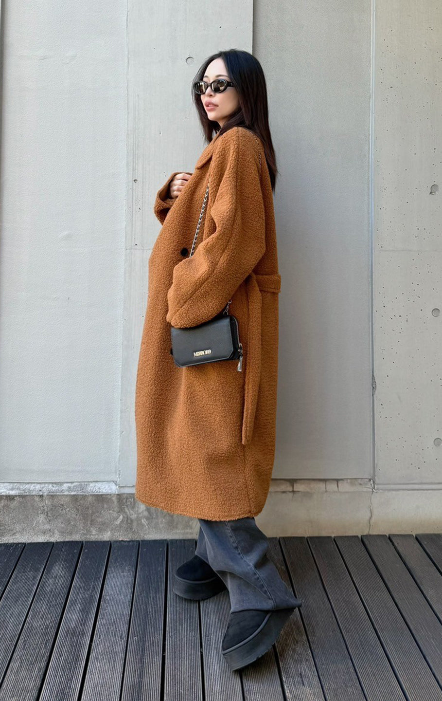 This is a boa fabric coat. Although it's lightweight, it's below-the-knee length and warm, and comes with a string that can be tied around the waist. There are pockets on both sides.