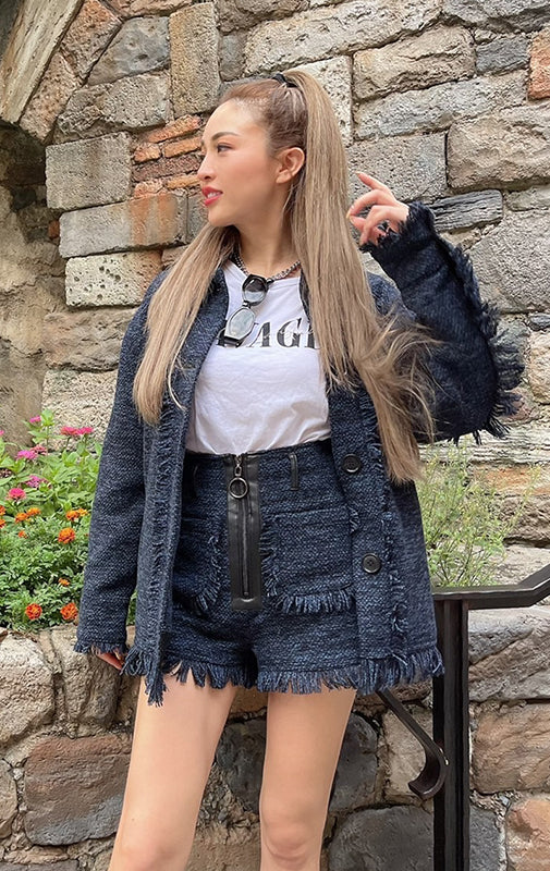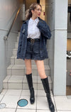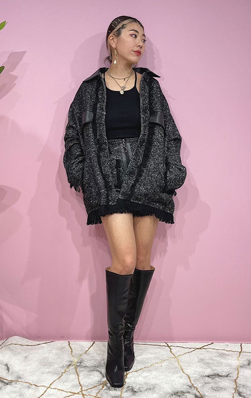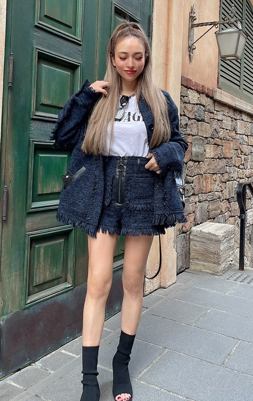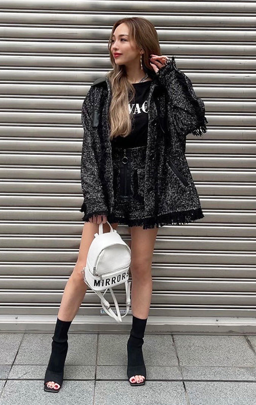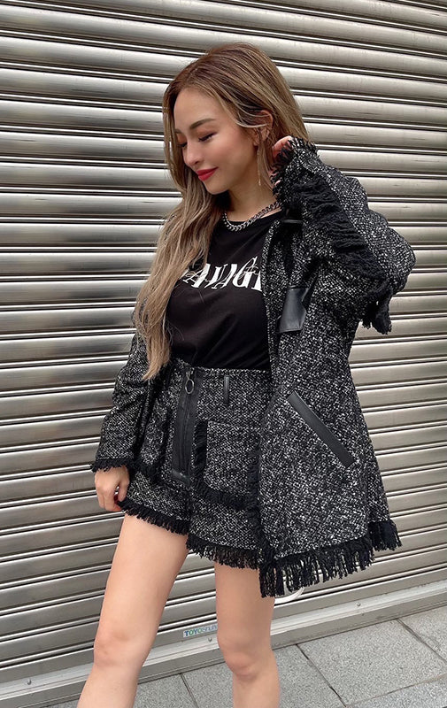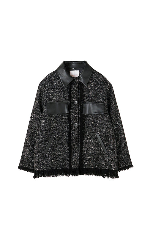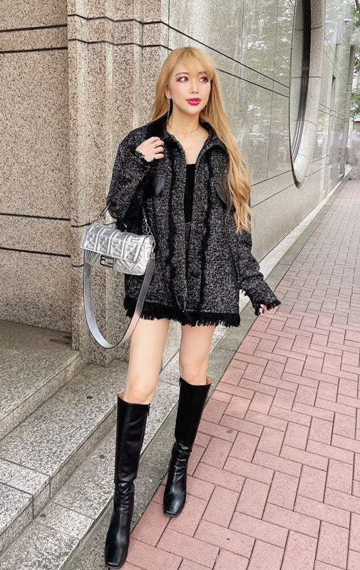 *All sale/outlet items cannot be returned or exchanged. Please understand this before purchasing. *As this is a sale item, we cannot accept returns or exchanges due to minor scratches or dirt. (We do not accept exchanges for sale items that are in good condition.) A jacket with a docking design made of tweed fabric and faux leather. Matching shorts are also available. It's easy to match with any outfit, and the slightly loose silhouette makes it easy to layer.