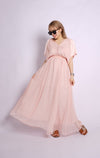 軽いシフォン素材とカットソー素材がレイヤードされたデザインなので、風になびくたびにゆれる質感がとても可愛いアイテムです。