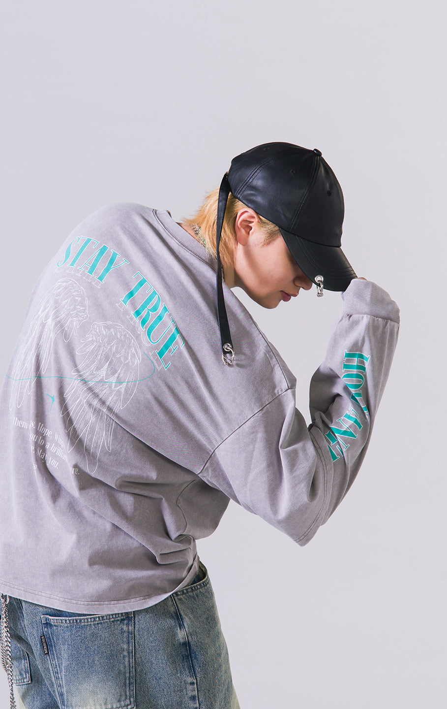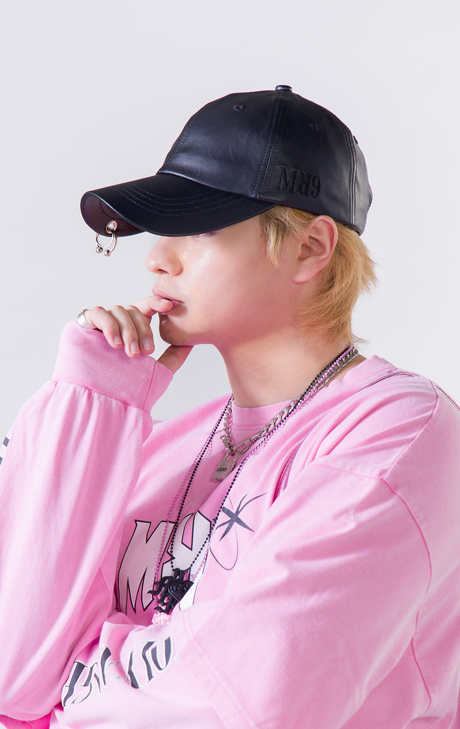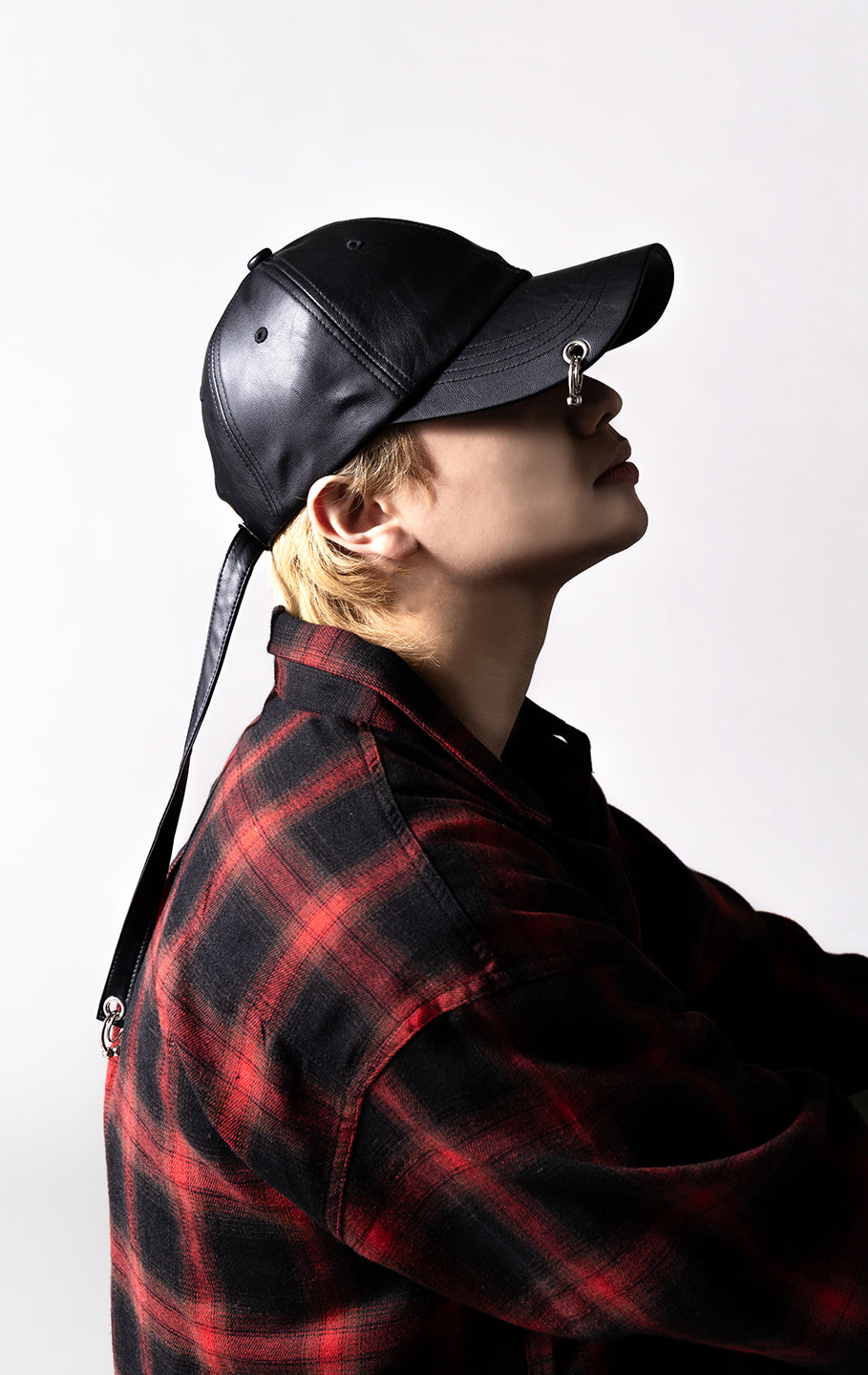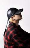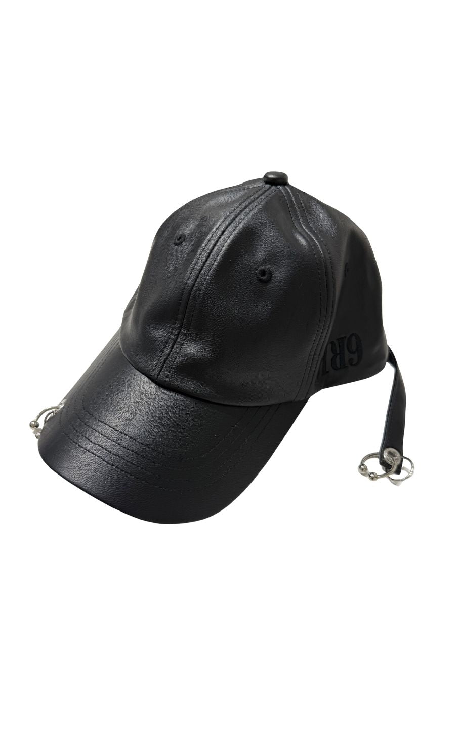 MIRROR9で定番人気のフェイクレザーキャップにRyuseiのこだわりのピアスをツバとベルトにあしらったデザイン。