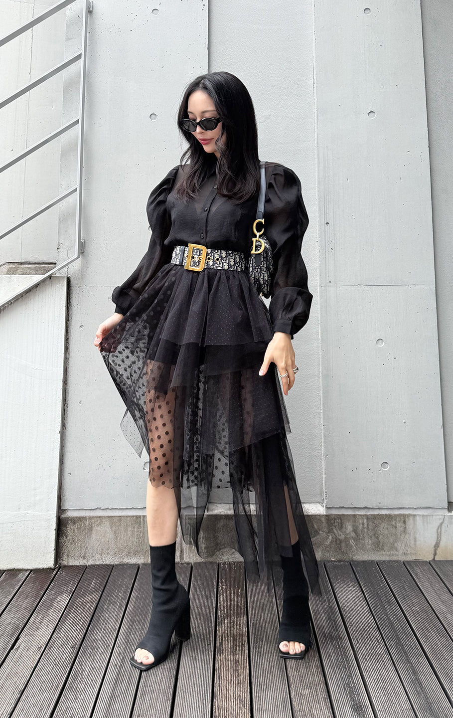 Asymmetrical tulle skirt. You can wear it over your favorite innerwear. Coordinate it with skinny pants or short bottoms. Can be worn casually or dressily. Elastic waistband can be adjusted all around.
